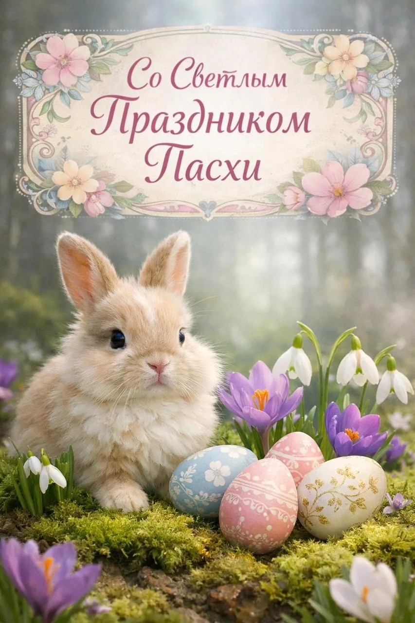 Надпись в нежной пастельной рамке: «Со Светлым Праздником Пасхи». Пушистый кролик сидит на мху среди первоцветов - крокусов и подснежников. Рядом с ним - три декоративных пасхальных яйца с тонкой росписью. Лесной фон размыт, легкий туман. Стиль: сказочная атмосфера, фотореализм, макро-съемка, мягкий рассеянный свет
