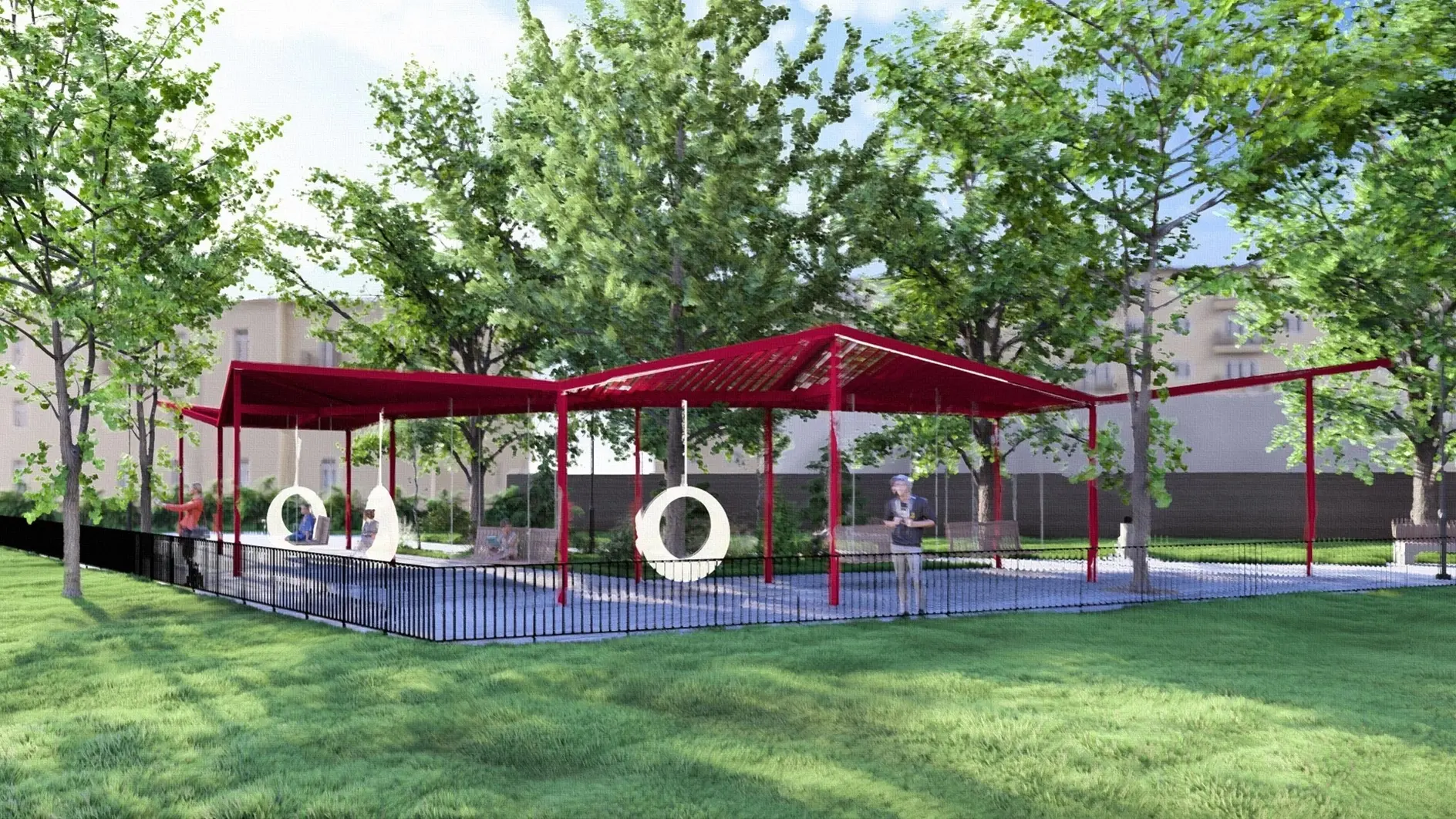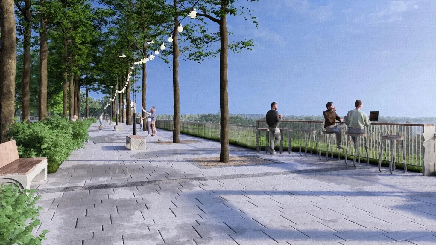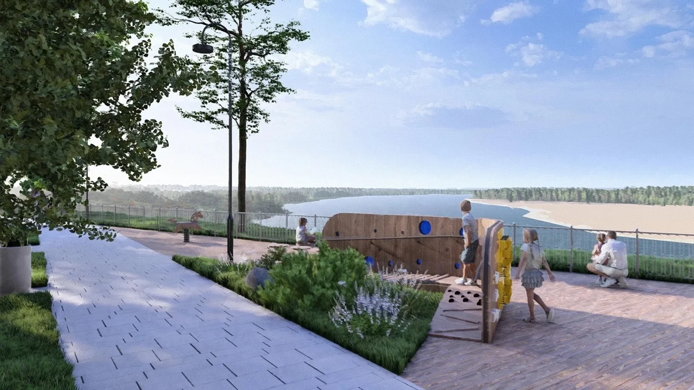 На участке вдоль реки расширят пешеходную зону и вымостят ее брусчаткой, создадут смотровые площадки, установят освещение, видеонаблюдение, качели, шахматные столики и скамейки, отремонтируют ротонду, создадут для нее архитектурную подсветку. На всей территории выполнят озеленение.
