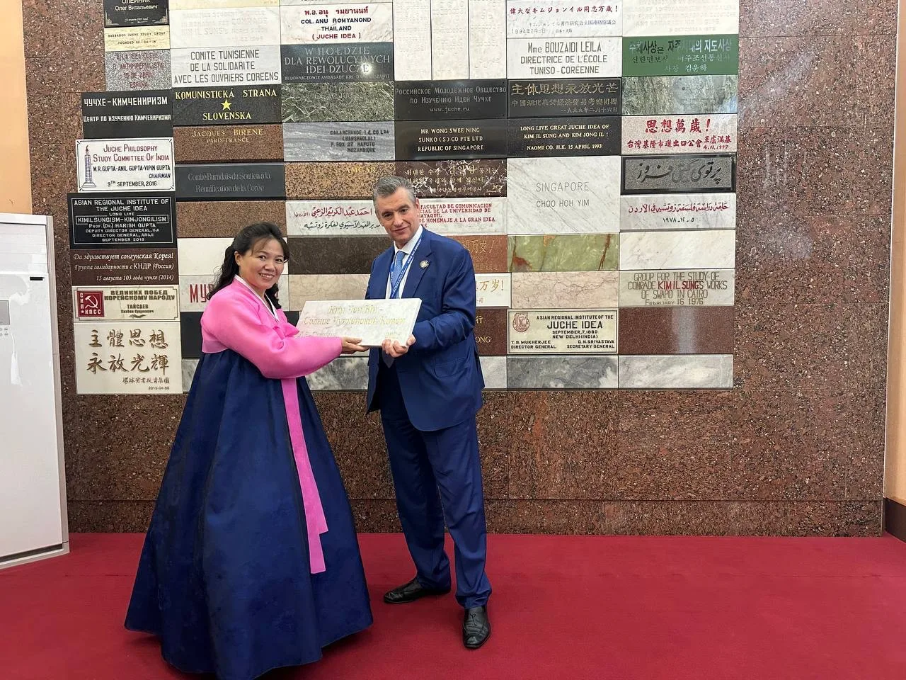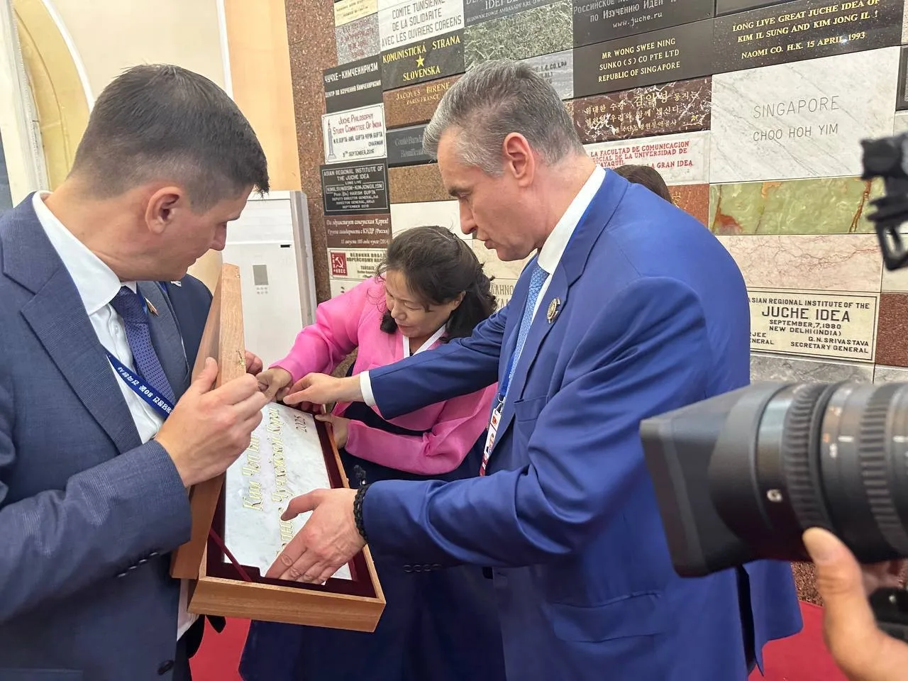 Оставили памятную табличку на Монументе идей чучхе — грандиозном памятнике, который олицетворяет коммунистическую идеологию корейского народа, разработанную основателем КНДР Ким Ир Сеном.