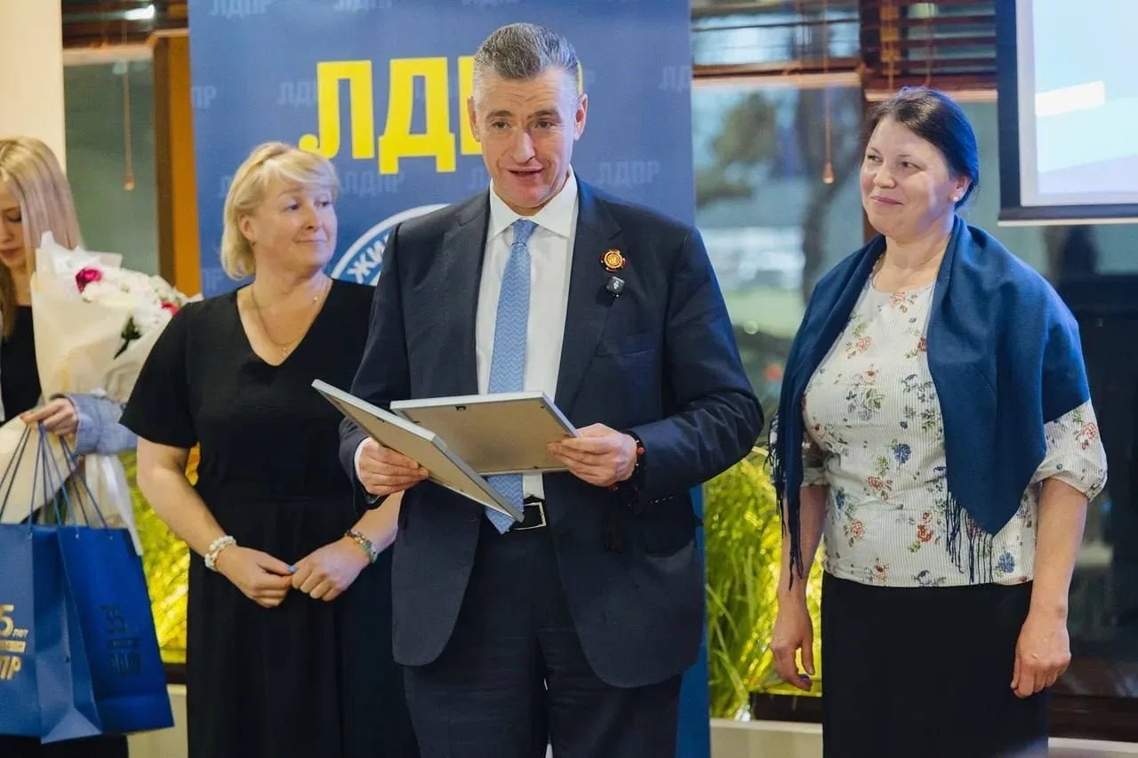 Завершил встречу с кировскими коллегами самым приятным — награждением. Вручил медали, учреждённые ЛДПР, двум активистам отделения — многодетным мамам, успешно совмещающим подчас сложную политическую работу с родительскими обязанностями.