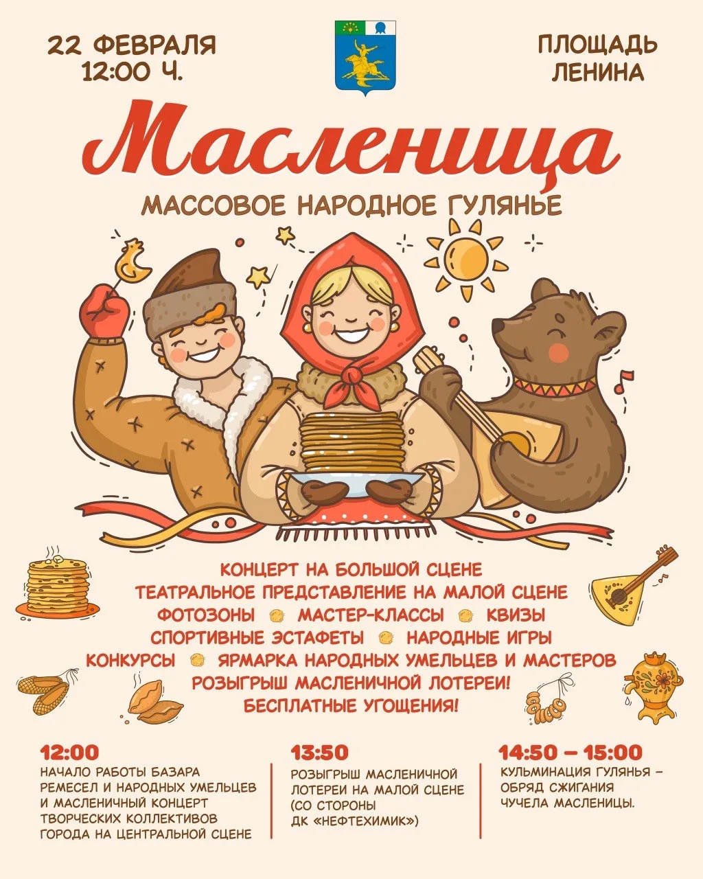 В программе праздника: концерт на большой сцене, театральное представление на малой сцене, фотозоны, мастер-классы, спортивные эстафеты, народные игры, квизы, конкурсы, ярмарка народных умельцев и мастеров, розыгрыш масленичной лотереи! Бесплатные угощения!