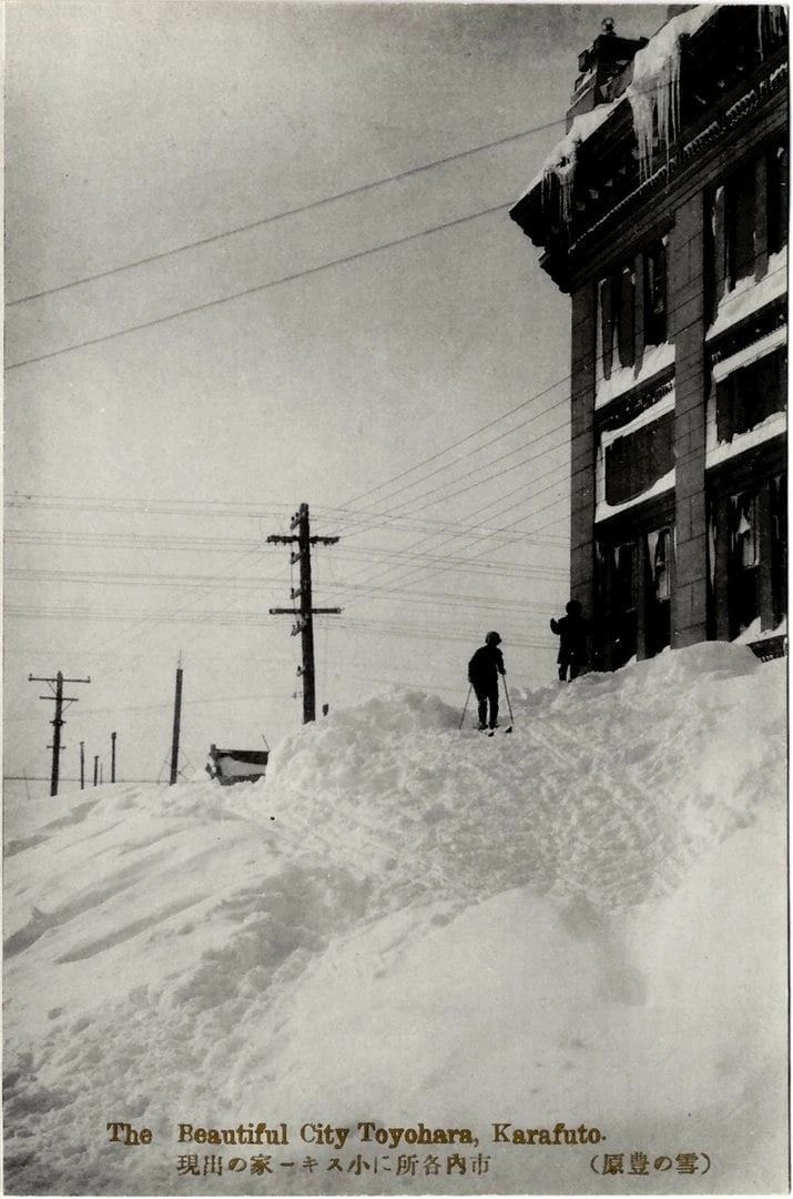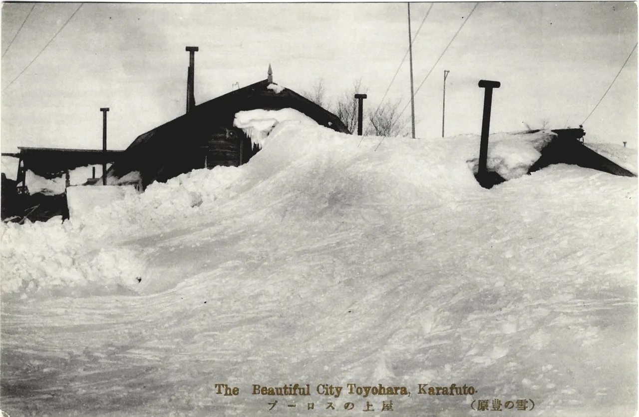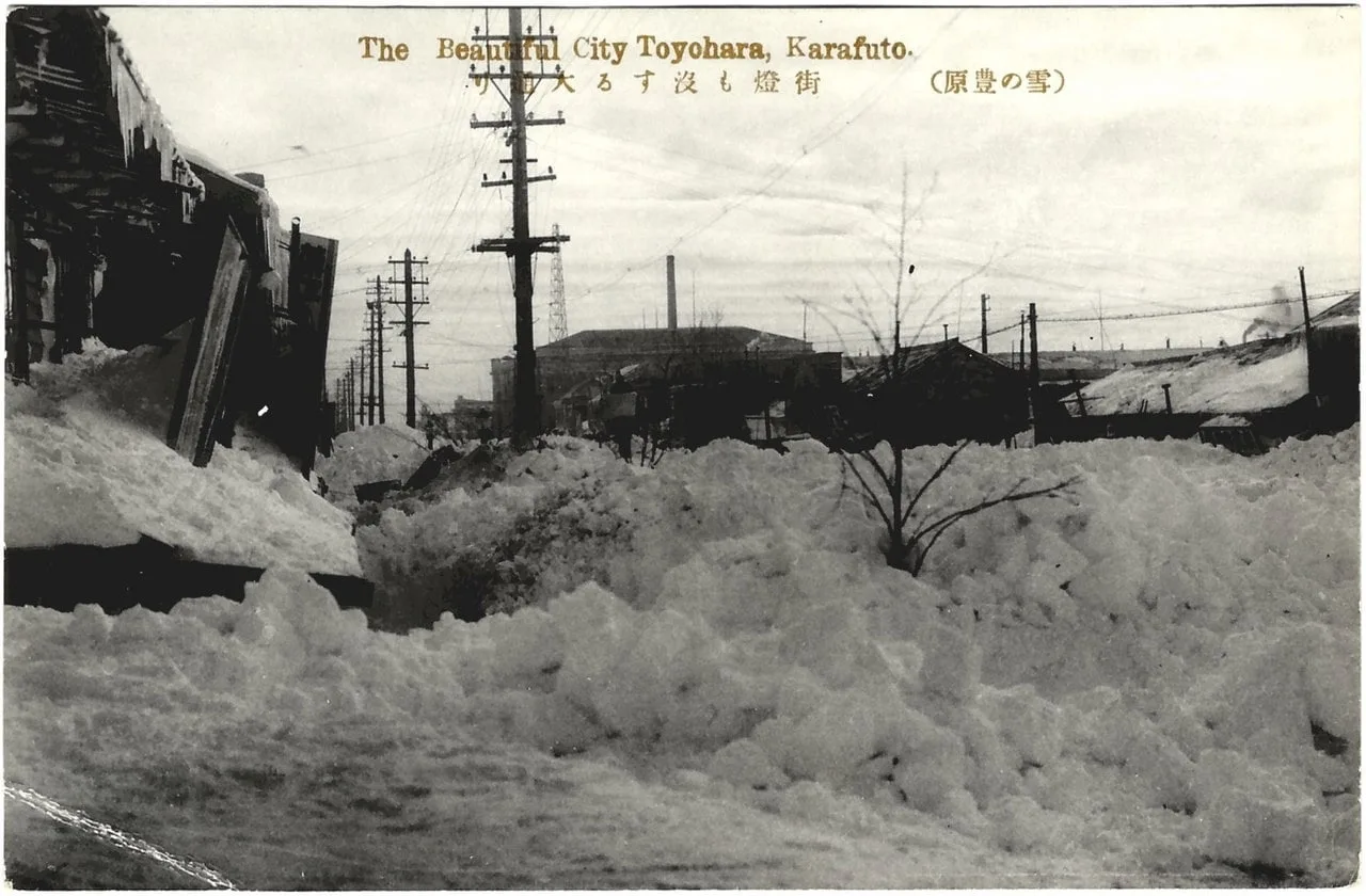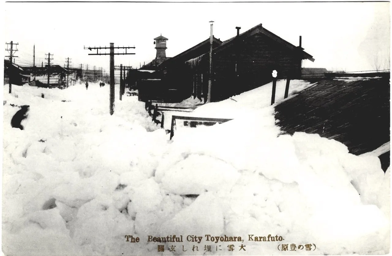 Карафуто. Тойохара (Южно-Сахалинск), снежная зима, дома, заваленные по крыши.