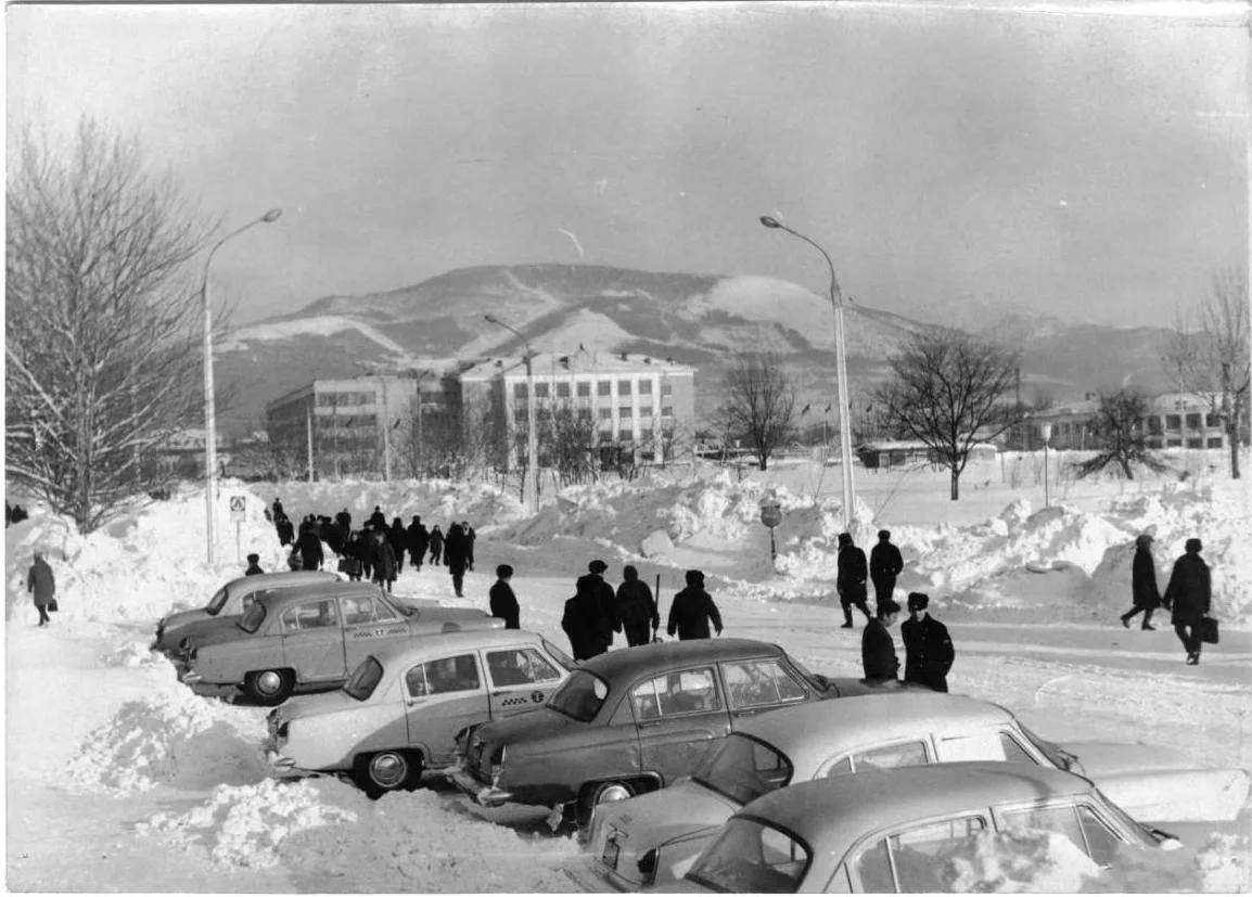 Привокзальная площадь Южно-Сахалинска после метели, 1970 год.