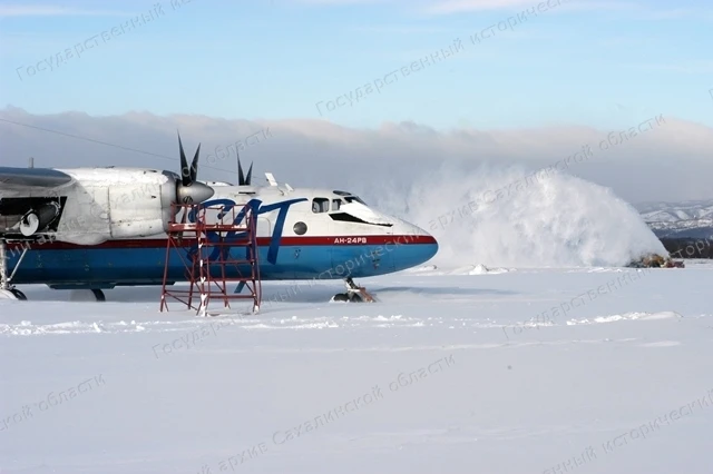 📸 Расчистка от снега летного поля аэропорта г. Южно-Сахалинска (Хомутово) после очередного циклона. На переднем плане – самолет АН-24 РВ авиакомпании SAT Airlines («Сахалинские авиатрассы»). 6 января 2003 г. Автор съемки М.М. Бугаев. @giaso. Ф. ФД. Оп. 24. Ед. хр. 856