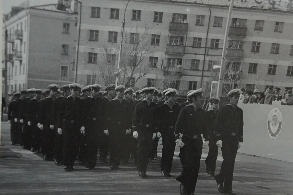 Первомайский парад. Курсанты мореходного училища. Город Невельск. 1977 год.