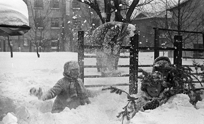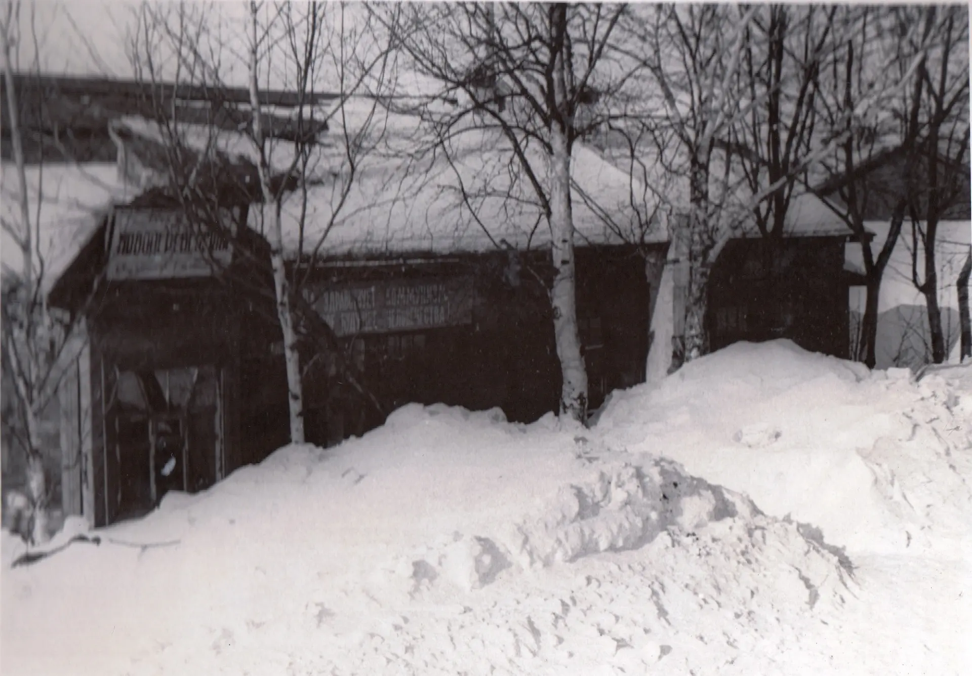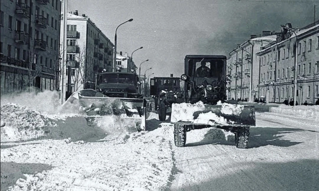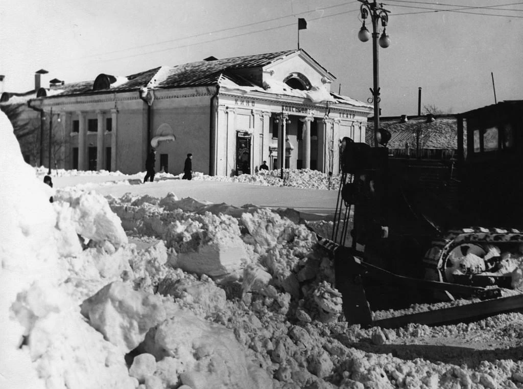 На фото расчистка от снега после метели перекрестка улиц Ленина и Сахалинской зимой 1968 года.