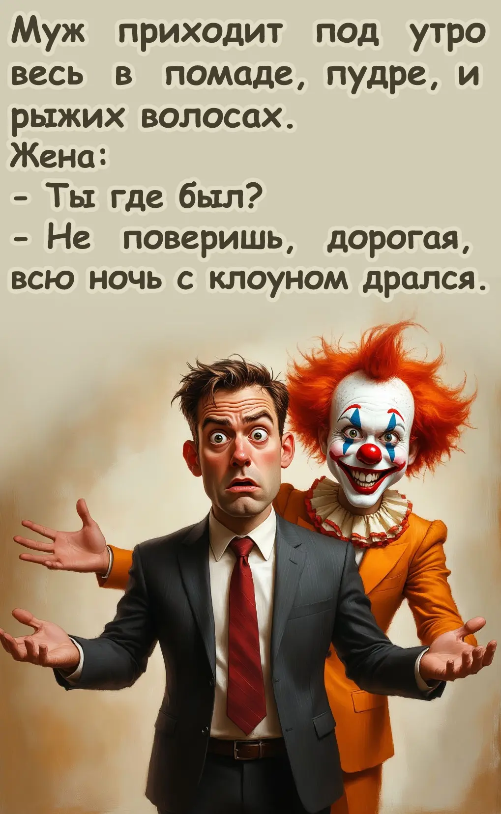 Заходит в квартиру, в коридоре разбросаны ботинки, джинсы, в душе вода течет... "Точно дома. Рано пришел. Наверное сюрприз приготовил!". Заходит в ванную. Шторка закрыта. Она моет руки, запускает одну руку за шторку, нащупывает ЕГО и со словами: "Колокольчики мои - цветики степные!" делает характерное перебирание пальцами. Выходит из ванной, идет на кухню приготовить что - нибудь вкусненькое. На кухне картина маслом: сидит муж, пьет чай...