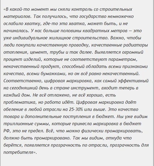 Зам. председателя комитета ГД по экономической политике Артём Кирьянов не стал скромничать и озвучил главную идею десятилетия: цифровая маркировка — для всех товаров.