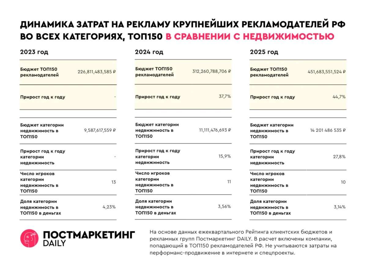 Динамика роста затрат в этой категории значительно отстает от общей. В 2024 году недвижимость показала прирост в 15,9% относительно общего прироста рекламодателей в 37,7%. В 2025 году — 27,8% против 44,7%. Также снижается и общая доля затрат рекламодателей этой категории в отношении общего объема рекламных бюджетов. Если в 2023 году затраты составляли 4,23% от общего объема, то в 2025 — 3,14%.