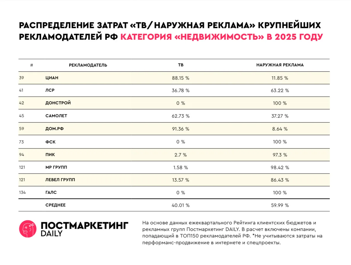 Распределение затрат тоже изменилось. Некоторые игроки в 2025 году совсем отказались от рекламы на ТВ в пользу интернета (ФСК). А другие, наоборот, отдают предпочтение телевидению, почти не размещаясь в наружной рекламе (ЦИАН, ДОМ.РФ).