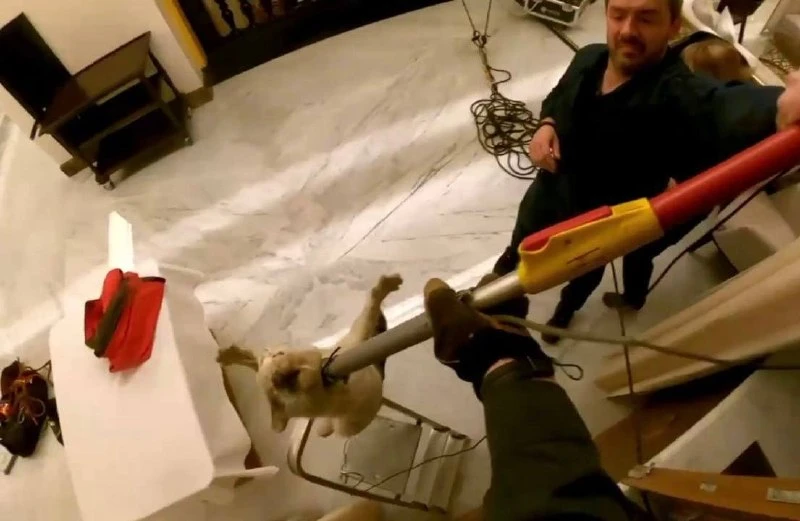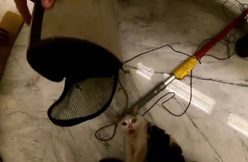 Хозяева здания встретили спасателей, организовали безопасность, страховку тентом и помогли подготовить помещение. Они даже нашли девушку, готовую забрать кота себе. Кот, увидев спасателя, стал искать пути отхода. Тогда спасатель взял петельку и преградил коту путь. Кот пошёл прямо в неё и попался.