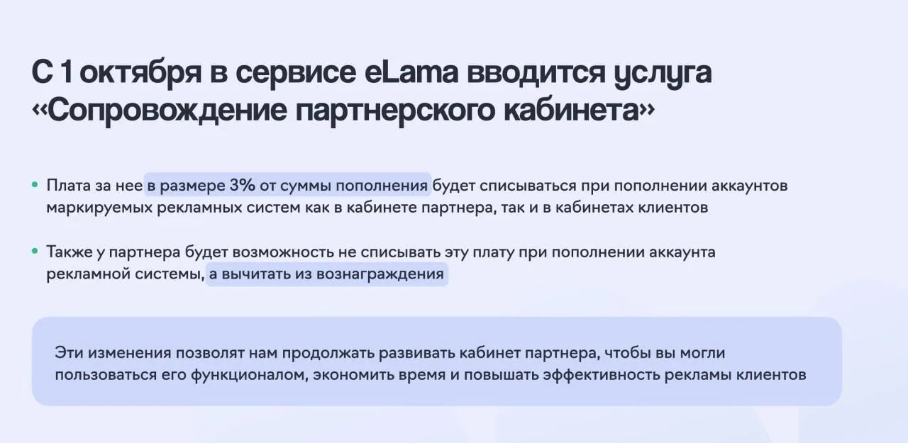 Плата будет списываться при пополнении аккаунтов маркируемых рекламных систем как в кабинете партнера, так и в кабинете клиентов. Сервис добавляет, что эти изменения позволят ему продолжить развивать кабинет партнера.