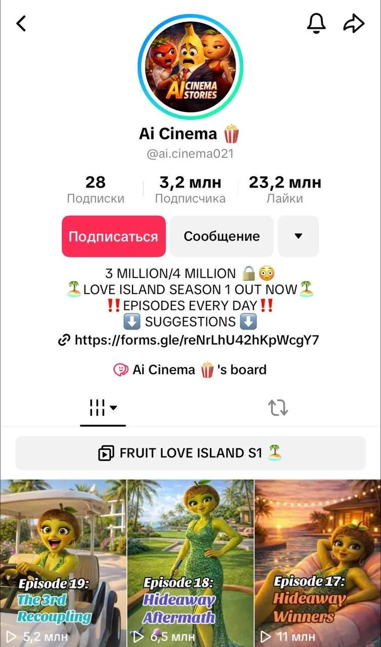 Например, сейчас один из самых просматриваемых каналов в TikTok — ИИ-реалити-шоу Fruit Love Island. Это что-то вроде «Каникул в Мексике», но только с фруктами и ягодами.
