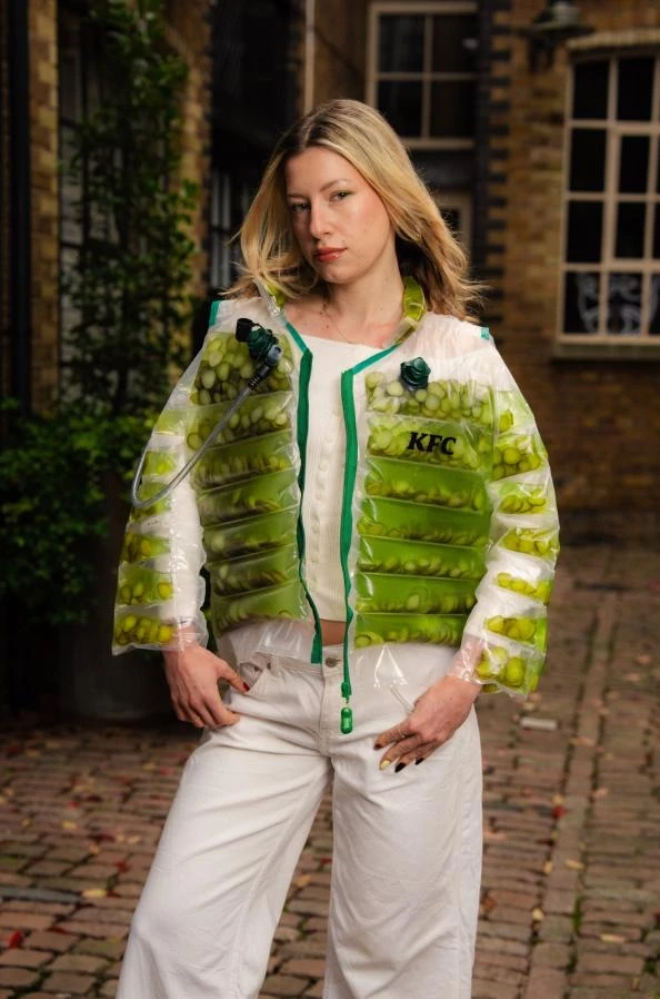 Пиджак из кетчупа от Heinz мы уже видели. Теперь KFC выпустили куртку с маринованными огурцами. Таким образом они рекламируют свою новую линейку меню Pickle Mania, в основе которой, как можно догадаться, — огурец.