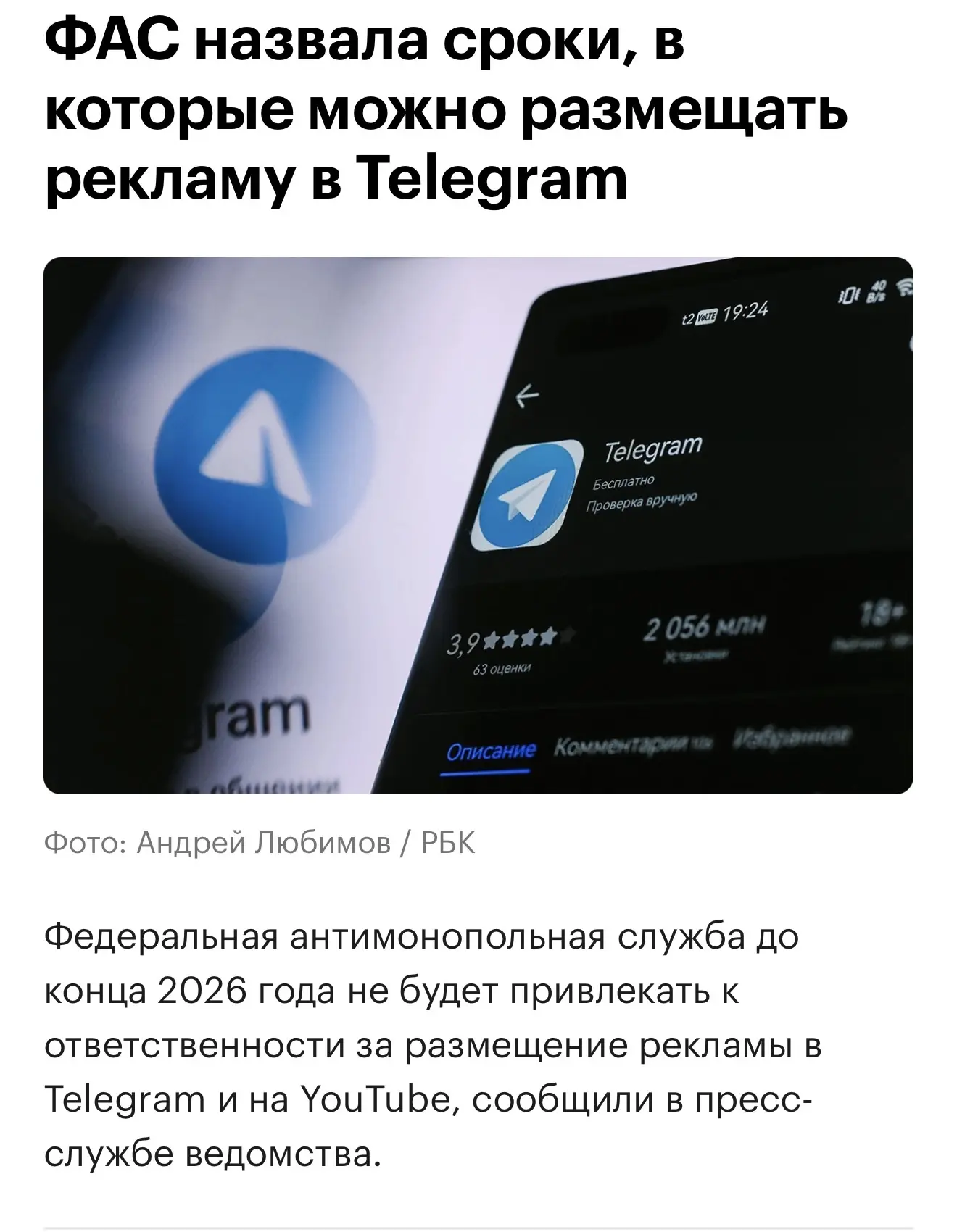 ⚡️Официально: ФАС до конца 2026 года не будет привлекать к ответственности за размещение рекламы в Telegram и на YouTube