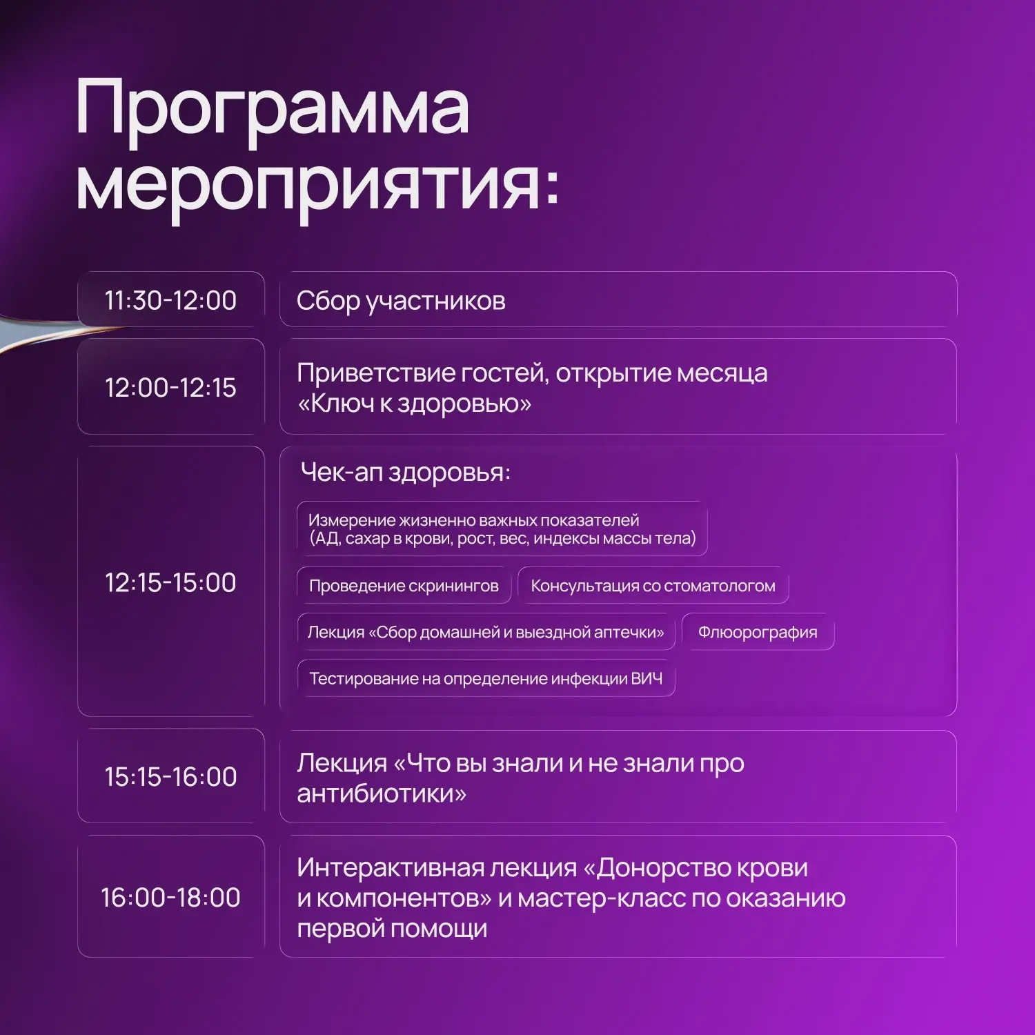 В рамках проекта студенты института прошли комплексное обследование: получили консультации узких специалистов, смогли оперативно проверить основные показатели здоровья на площадке волонтеров-медиков, а также приняли участие в обучающих мастер-классах и профилактических беседах, в том числе по вопросам ВИЧ-инфекции.