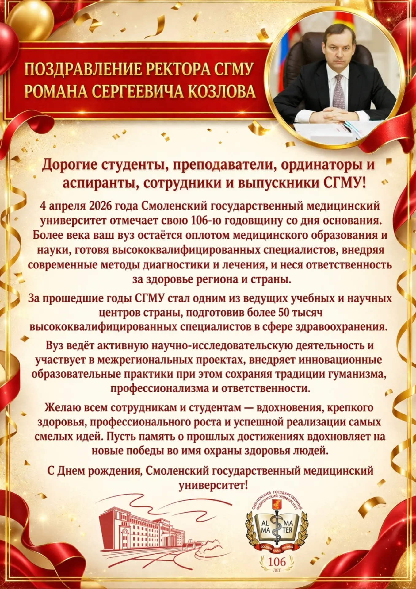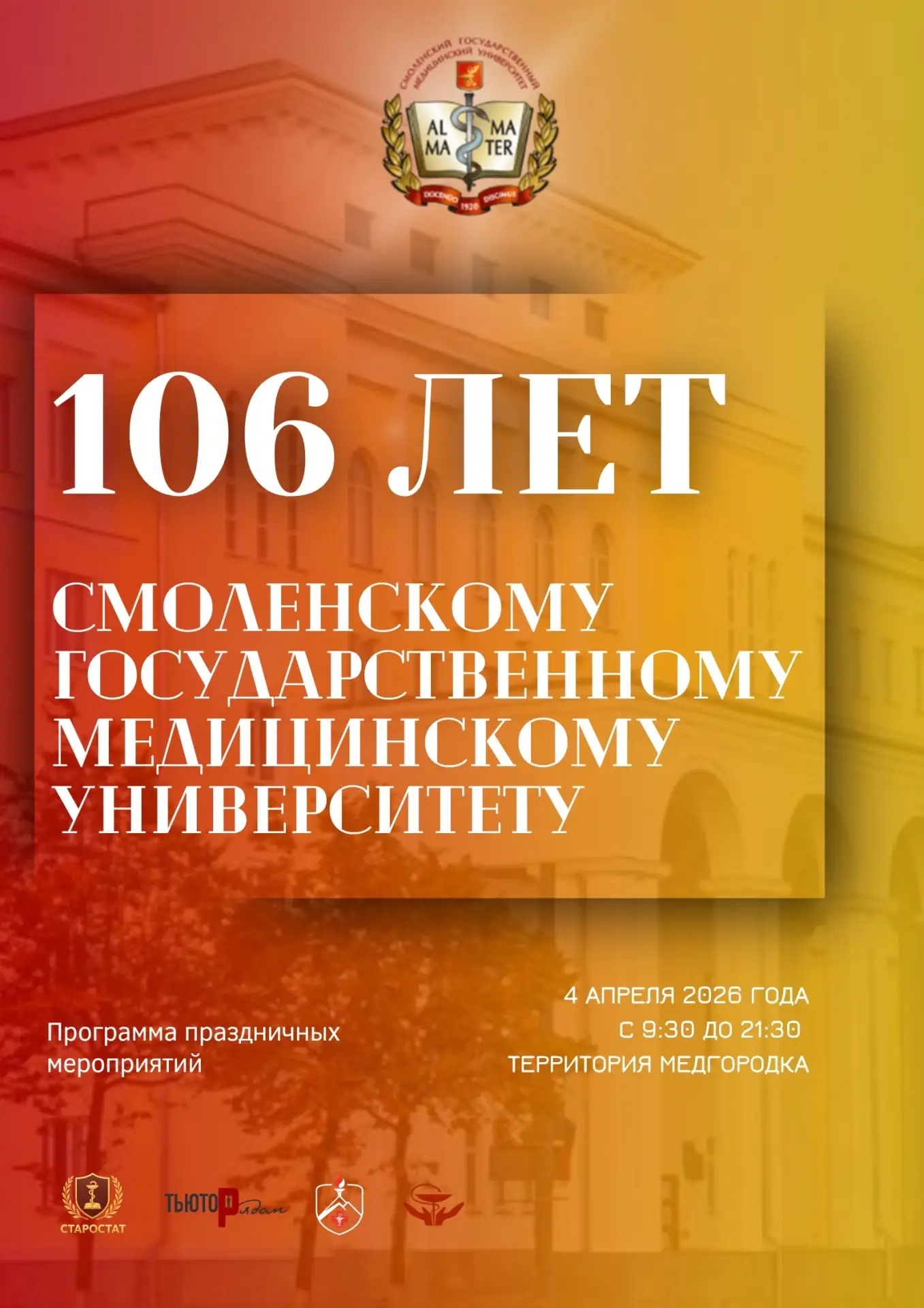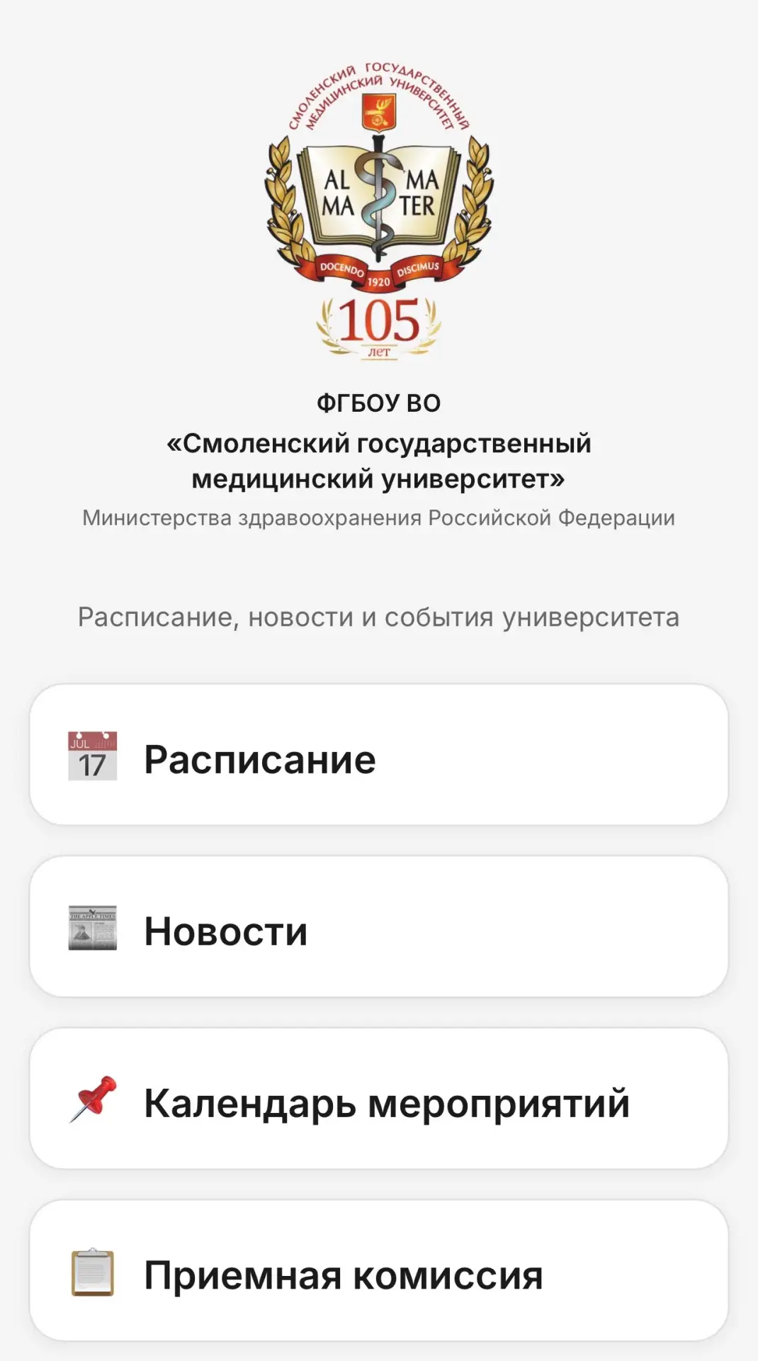 Смоленский государственный медицинский университет основан 4 апреля 1920 года. Наш университет дает возможность получить высшее образование, заниматься научной деятельностью, работать по гранту, обмениваться опытом с лучшими вузами мира.