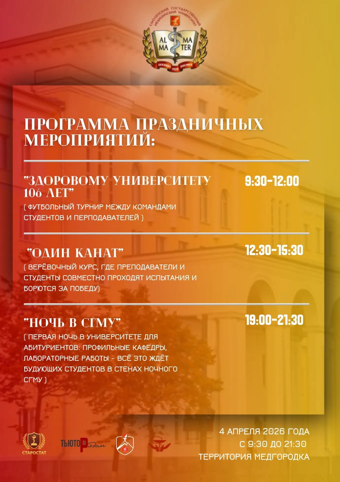 Следите за обновлениями на официальном сайте СГМУ и в наших социальных сетях, чтобы не пропустить анонсы мероприятий и важные новости приёмной кампании 2026 года.
