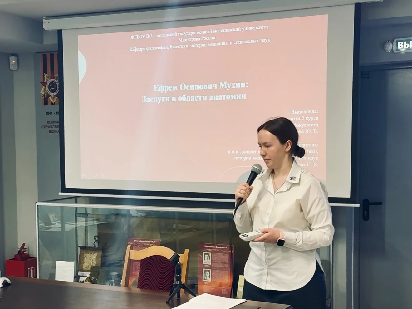 Ребята рассказали о многогранной деятельности Мухина: его вкладе в анатомию и физиологию, роли основоположника отечественной травматологии и реаниматологии. Отдельно отметили связь профессора со Смоленщиной — в Вяземском уезде он развивал медицину, помогал крестьянам и занимался благотворительностью. Сегодня имя Е.О. Мухина носит Вяземское медицинское училище.