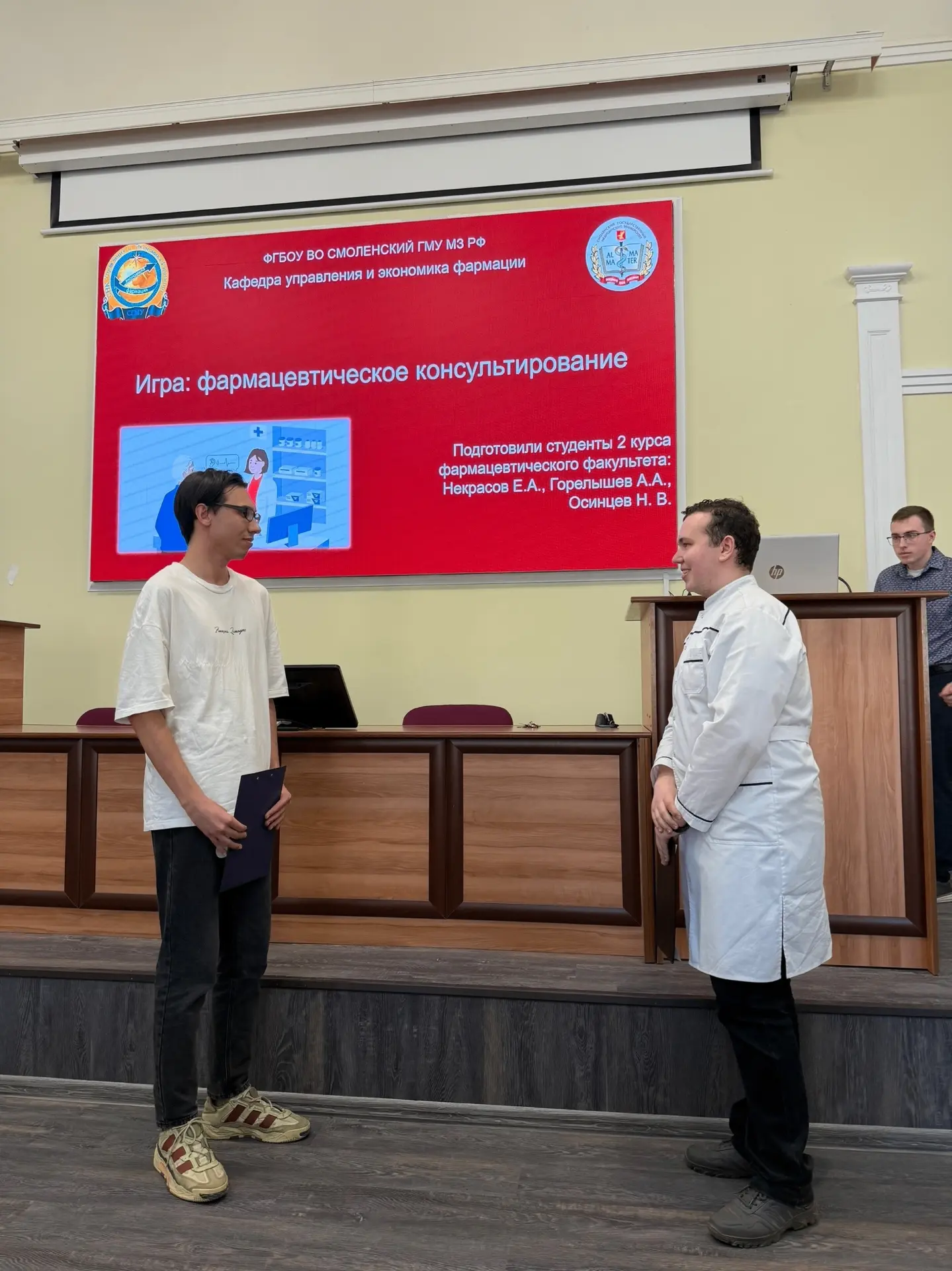 Студенты Смоленского государственного медицинского университета приняли участие в заключительном этапе, который состоялся в Гродненском государственном медицинском университете. Нашу команду сопровождали декан педиатрического факультета Сосин Денис Владимирович и заведующий кафедрой нормальной физиологии Евсеев Андрей Викторович.