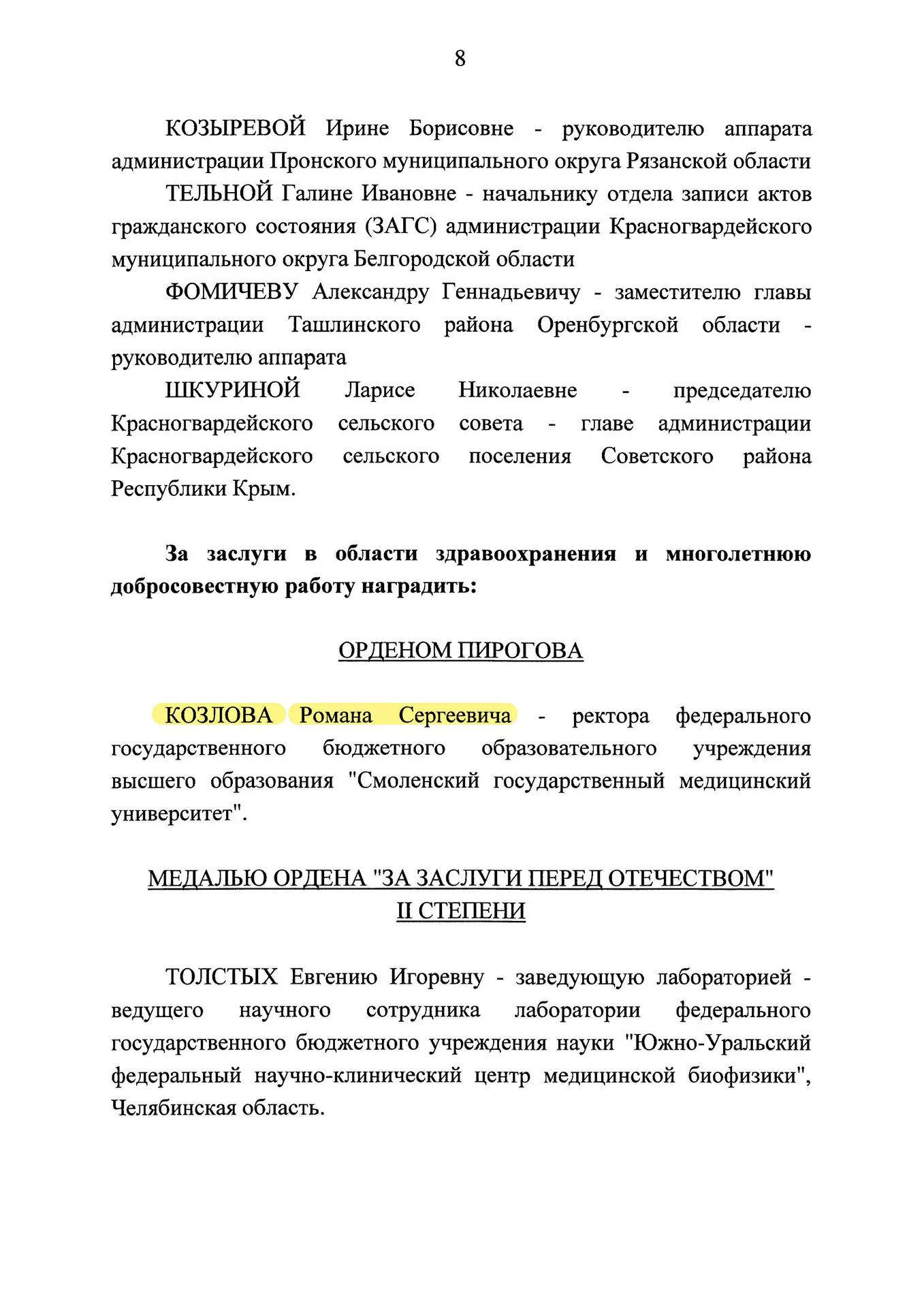 За заслуги в области здравоохранения и многолетнюю добросовестную работу Указом Президента РФ Козлов Роман Сергеевич награжден «Орденом Пирогова».
