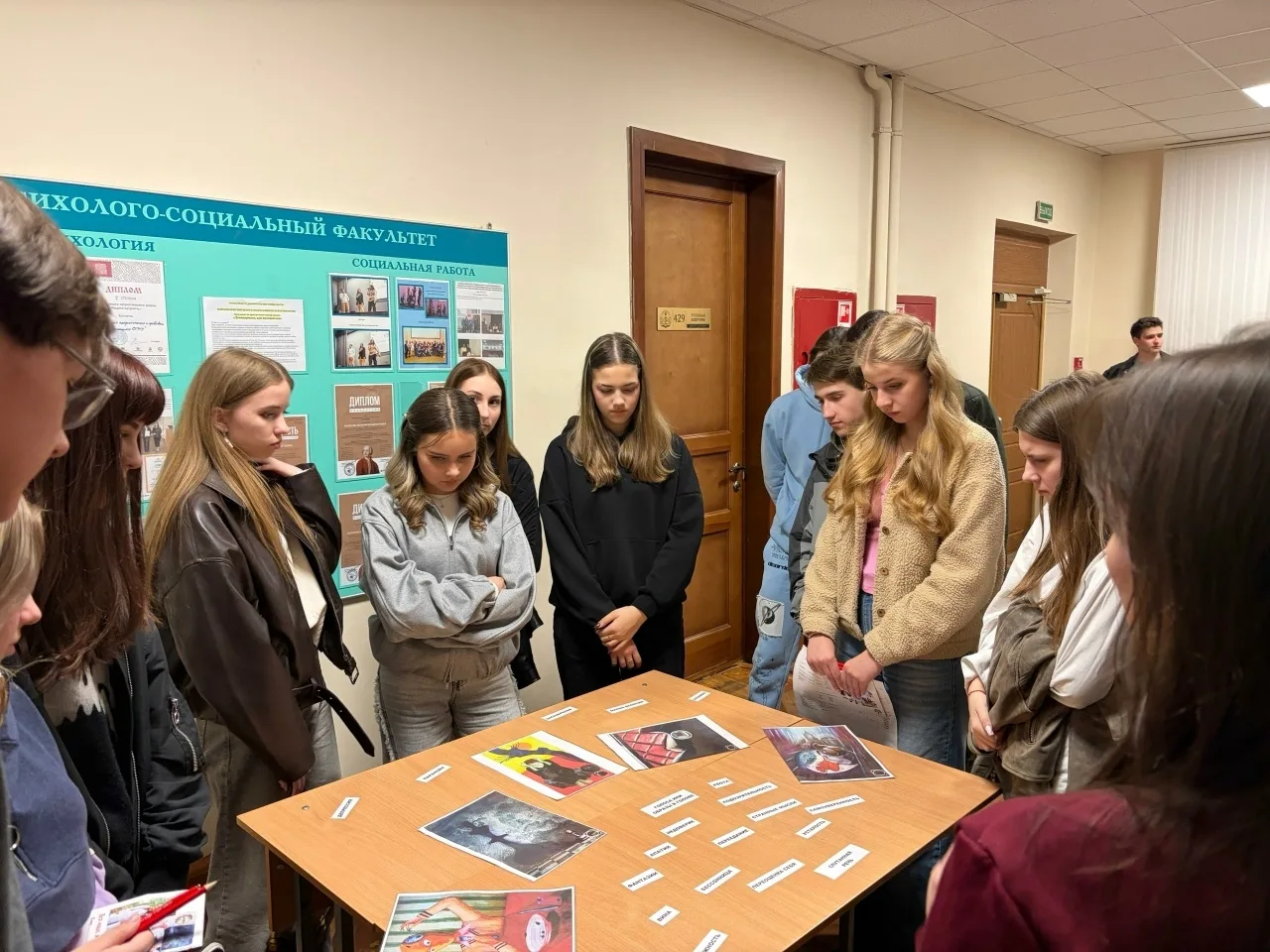 Далее гости посетили психолого-социальный факультет. Доктор психологических наук Татьяна Валентиновна Уласень и студенты 4 курса рассказали школьникам о своем факультете, о профессии клинический психолог и о востребованности данной профессии для общества. Они провели с группой школьников несколько психологических тестов показав, как важно развивать взаимопонимание и доверие в коллективе.