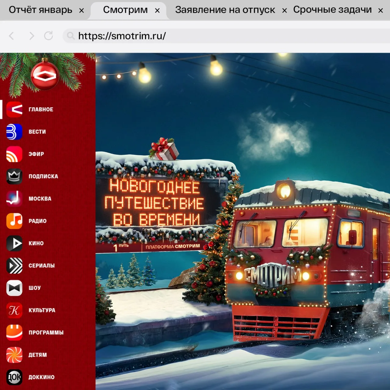 Приглашаем вас отправиться в большой новогодний маршрут — на волшебном поезде «Смотрим», который проходит сквозь годы, эпохи и воспоминания. От самых тёплых кадров из детства до захватывающих историй и возможности заглянуть в будущее.