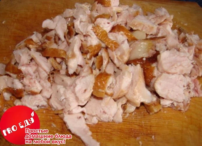 Приготовьте куриное филе, лучше всего сварить его или запечь. Нарежьте кубиками.