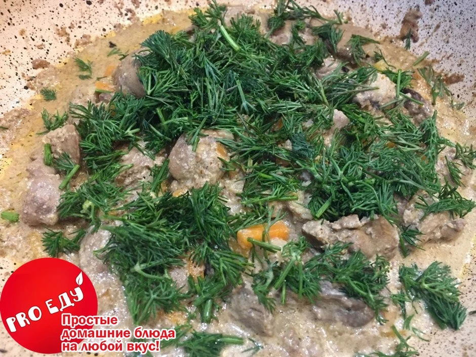 3. Добавить соль, перец и сметану. Потушить еще 5 минут. Посыпать мелко порезанным укропом.
