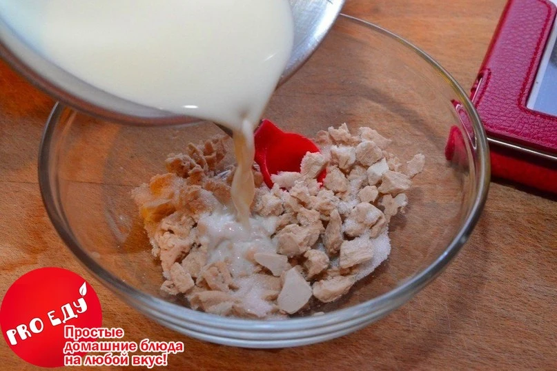 1. Разделить молоко на две части. Одну часть нагреваем на огне, чтобы молоко было теплым, но не горячим. Снимаем с огня, постепенно добавляем сахар, соль, муку, интенсивно помешивая венчиком до достижения однородной массы.