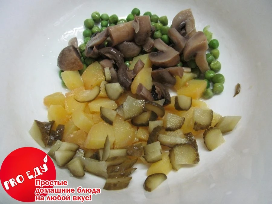 Такими же кубиками нарежьте маринованные и свежие огурцы.