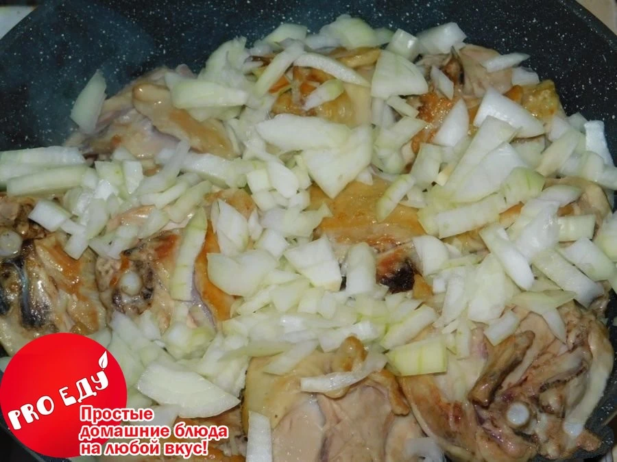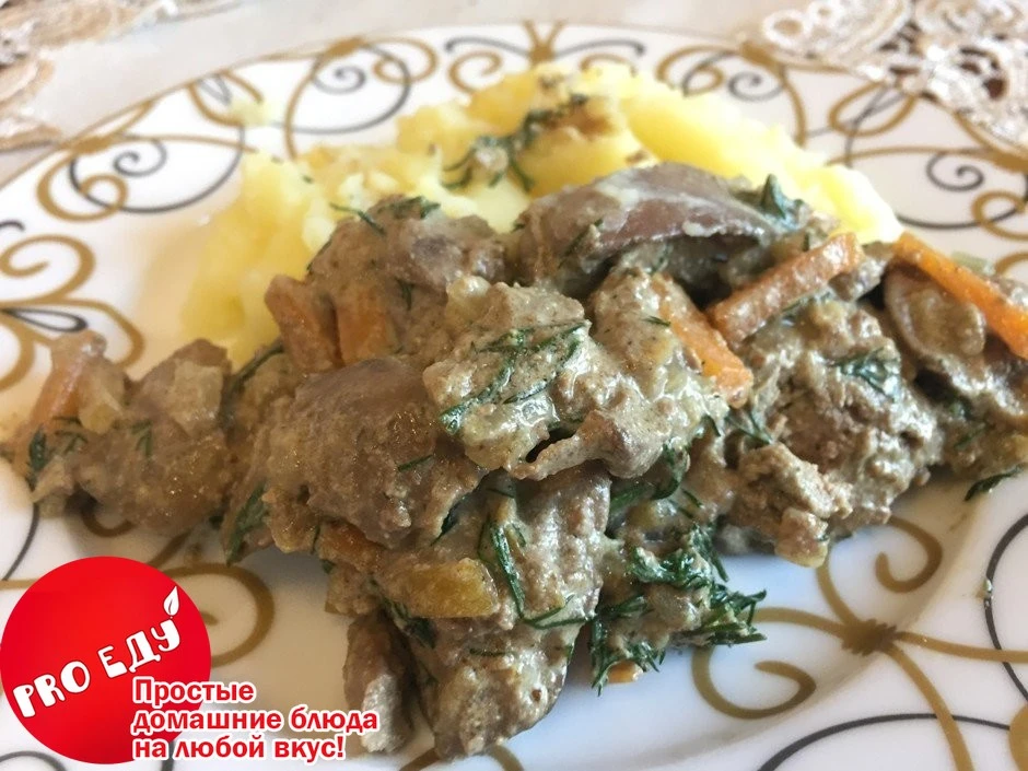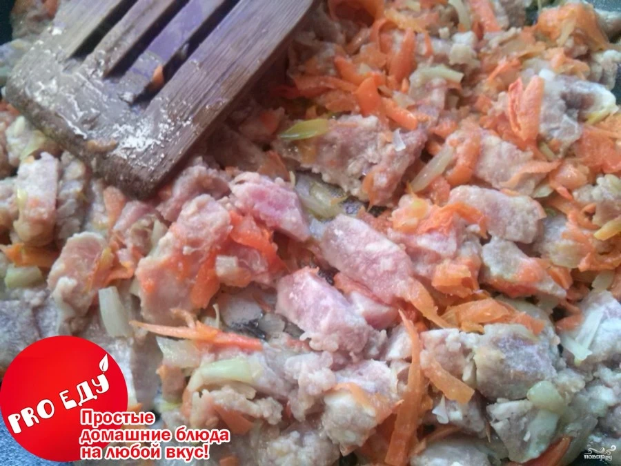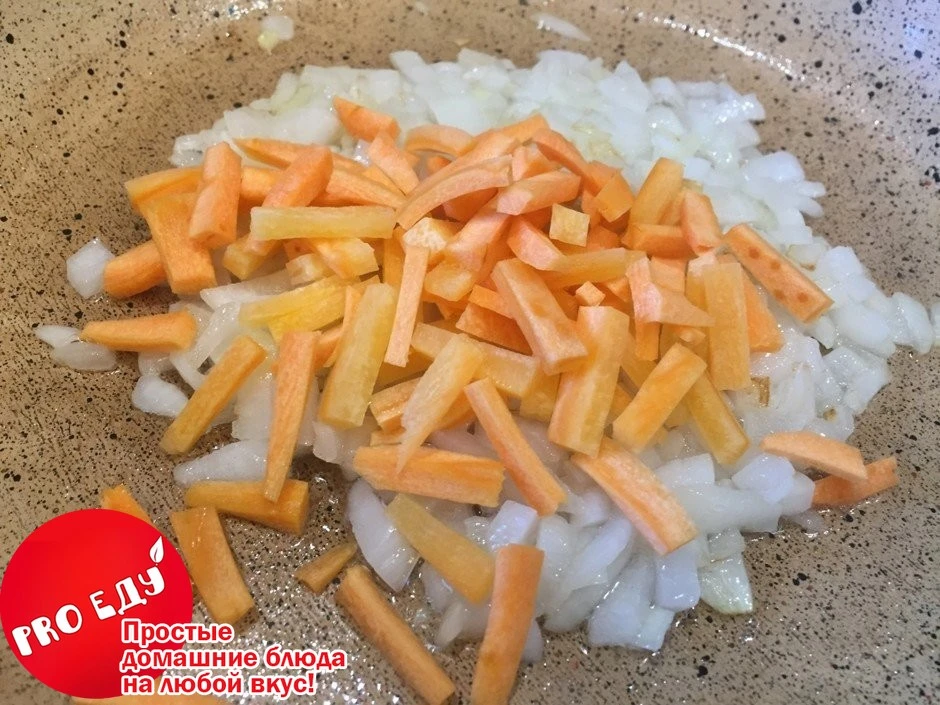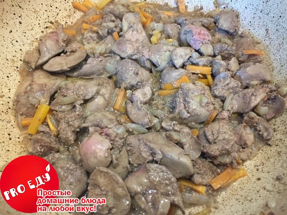 2. Нарезать лук и морковь, обжарить 5-7 минут. К луку и моркови добавить куриную печень. Жарить около 15 минут.
