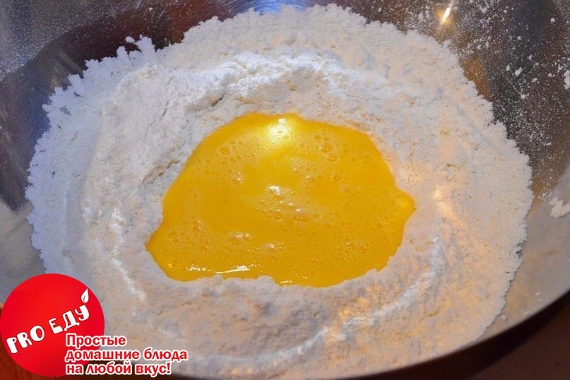 Просеиваем в отдельную чашу муку, добавляем соль и сахар. Руками делаем небольшое углубление и вливаем в него яйца.