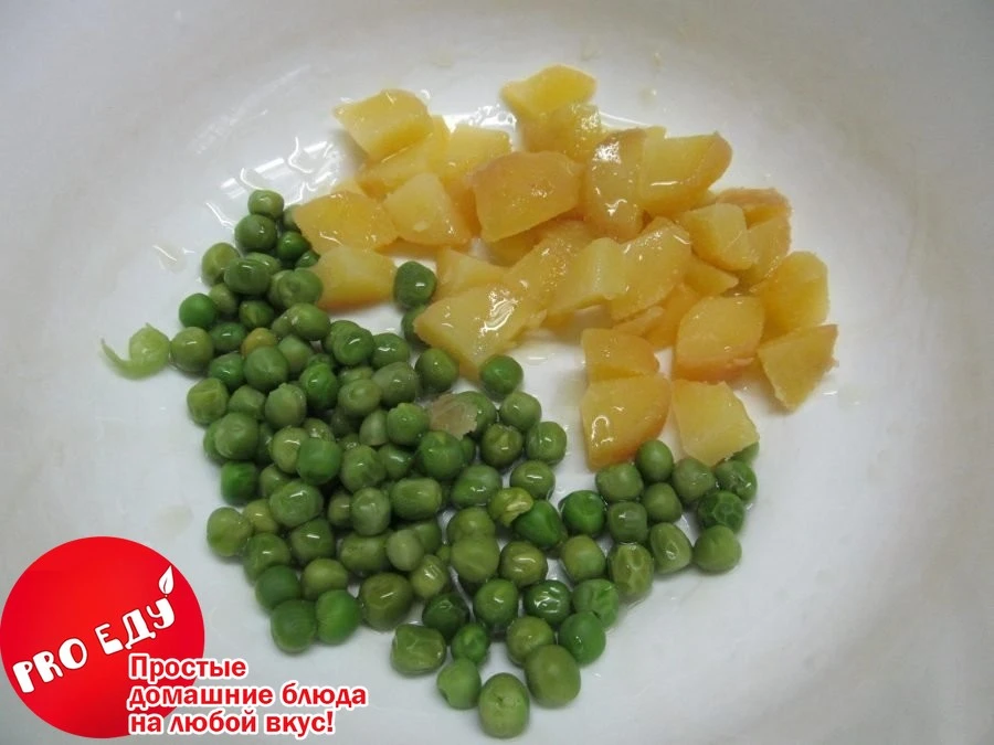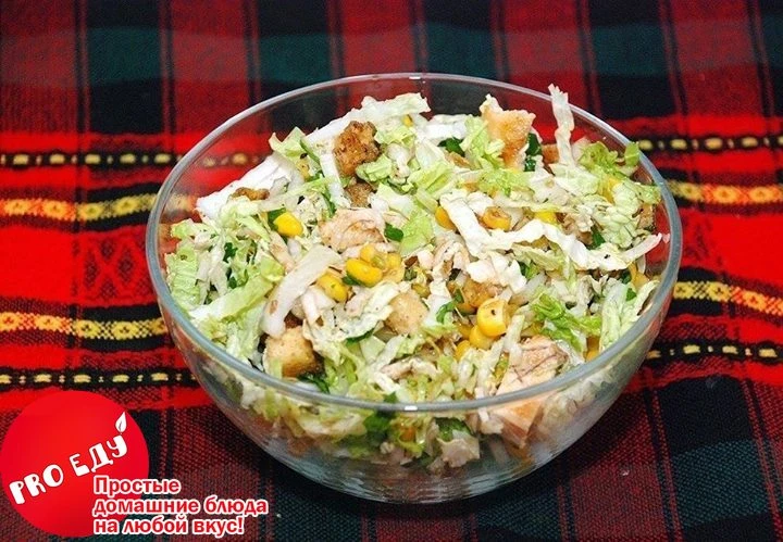 4. Туда же добавьте кукурузу, измельченную зелень и сухарики. Мелко нарежьте луковичку.