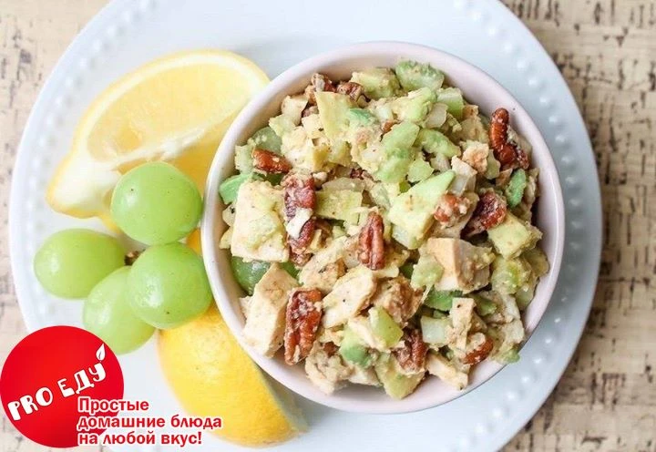 3. Куриное филе нарезаем кубиками и обжариваем на сковороде-гриль до готовности. Добавляем курицу в салат, также кладем нарезанный виноград без косточек и обжаренные на сковороде орехи.
