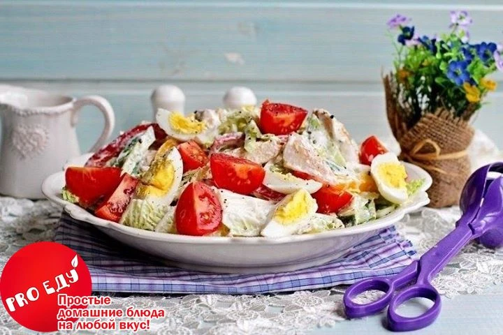 5. Полить заправкой овощи и курицу, выложить на салат нарезанное отварное яйцо и дольки помидоров. Приправить по вкусу. Сразу подавать к столу.