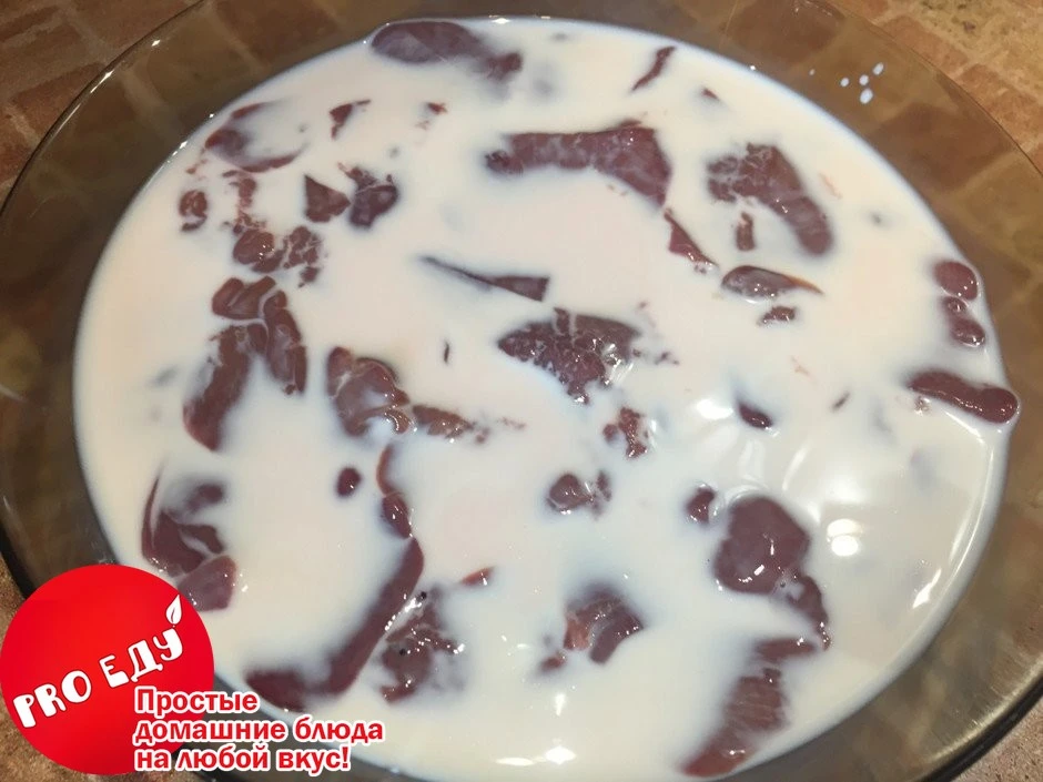 1. Подготовить печень, промыть. Залить молоком, убрать в холодильник на 30 минут.