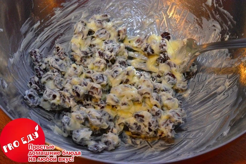 Заправьте ингредиенты несладким йогуртом, смешанным с горчицей, хорошо перемешайте.