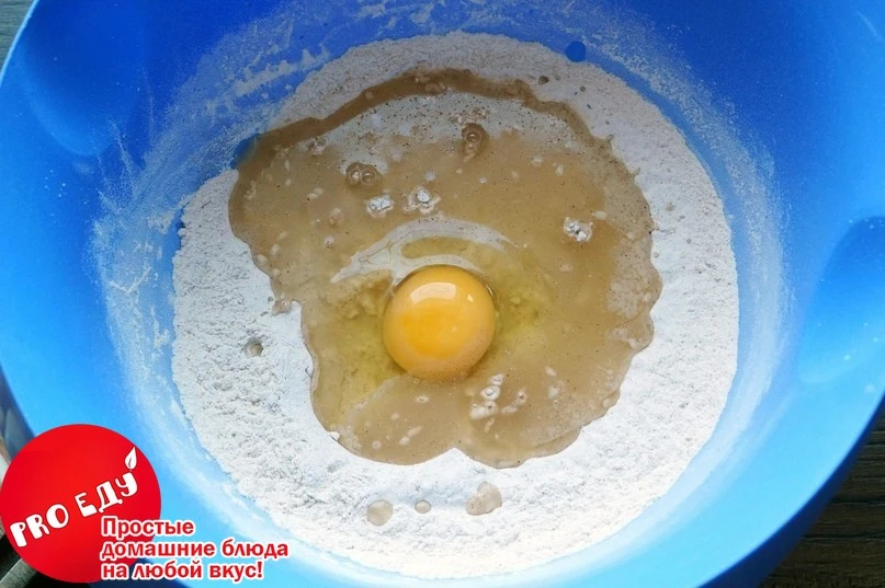 Дрожжи за это время уже должны были подойти, вливаем их тоже в муку. Делая медленные движения по кругу, смешиваем муку с жидкими ингредиентами.