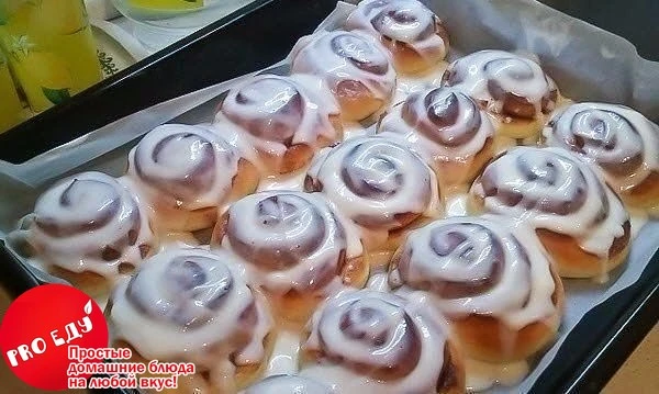 9. Пока булочки пекутся, готовим глазурь. В оригинальном рецепте предлагается смешать пудру, ваниль и молоко и полить булочки. Они пропитываются и становятся сочными. Я добавила еще немного сыра. По вкусу глазурь напоминает сгущенку, только не такая сладкая. Можно положить много сыра и чуть-чуть пудры, сделать глазурь консистенции сметаны, а не жидкую. Тогда булочки не столько пропитываются, сколько покрываются плотной глазурью сверху
