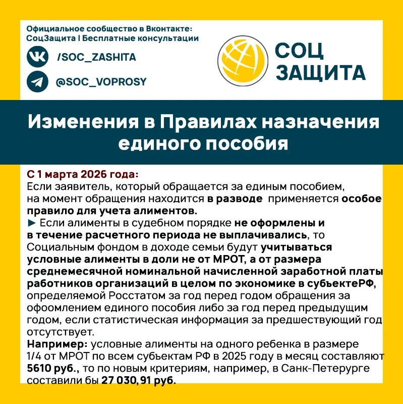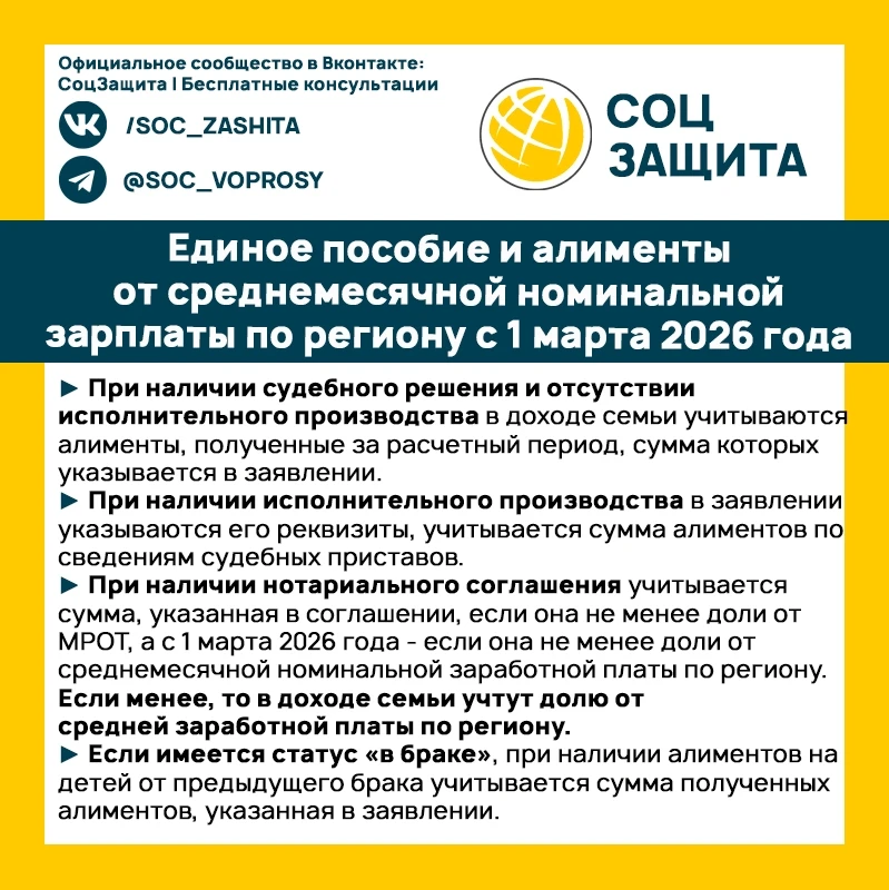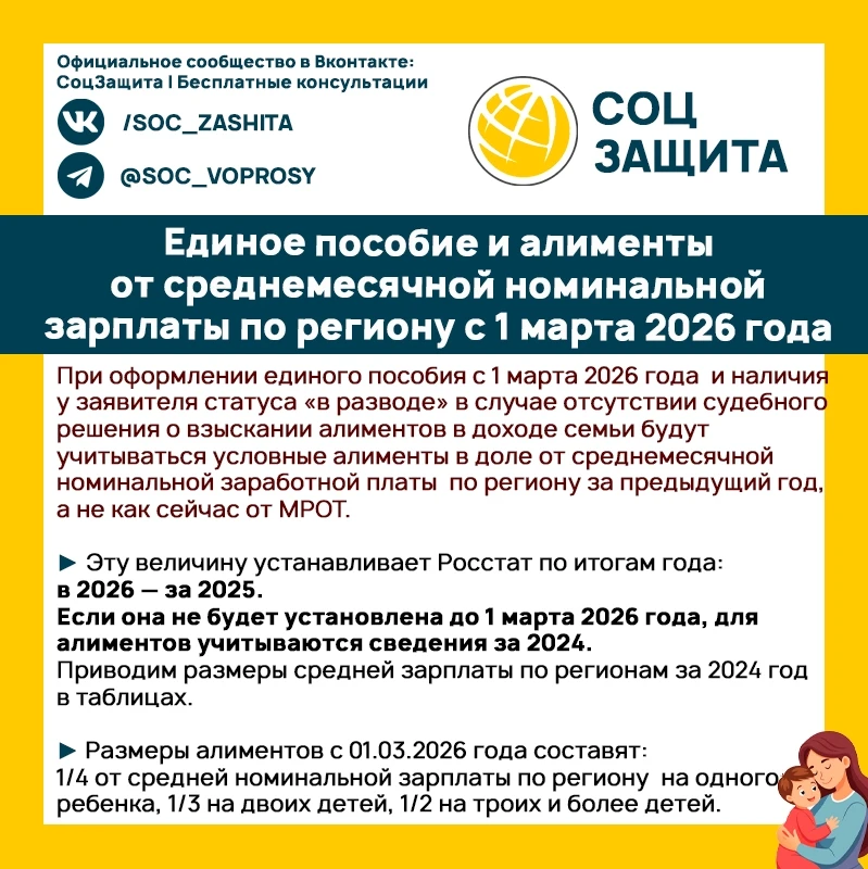 Единое пособие и алименты от среднемесячной номинальной зарплаты по региону с 1 марта 2026 года.