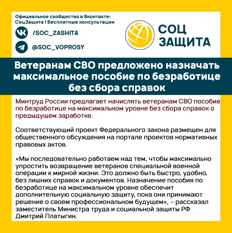 Ветеранам СВО предложено назначать максимальное пособие по безработице без сбора справок.