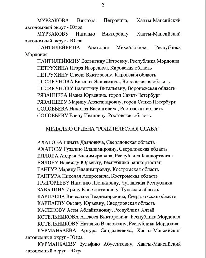 ✅ Президент Российской Федерации Владимир Путин 2 декабря 2025 года подписал указ о награждении многодетных семей страны почётными государственными наградами: