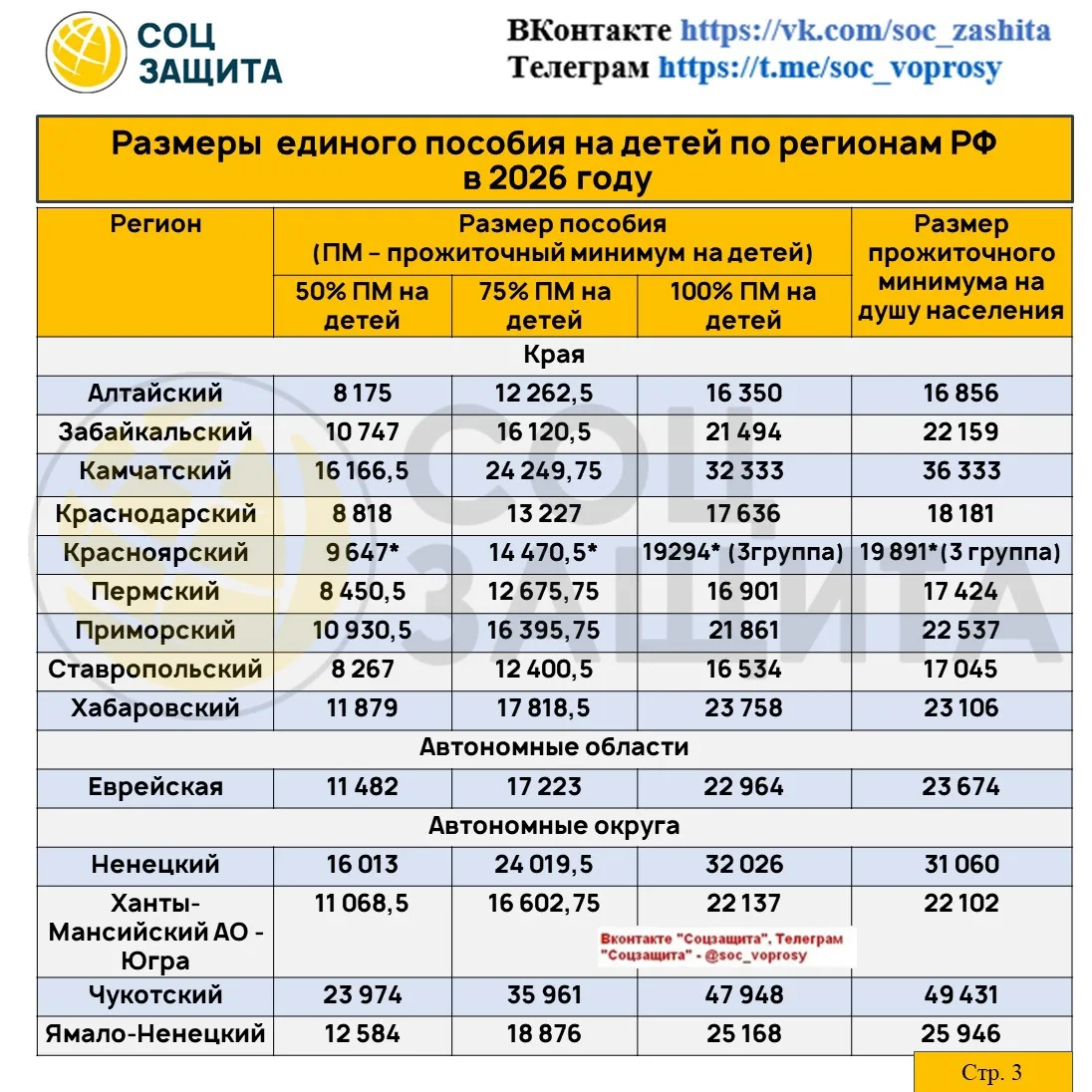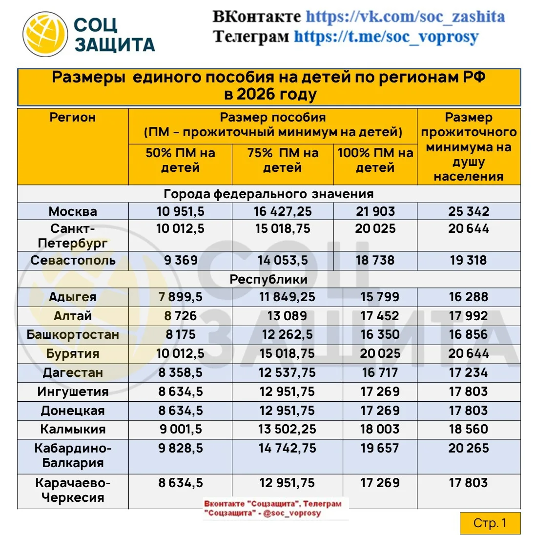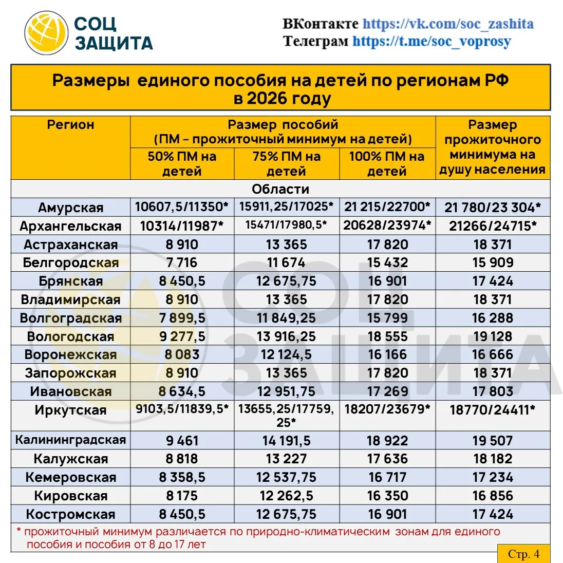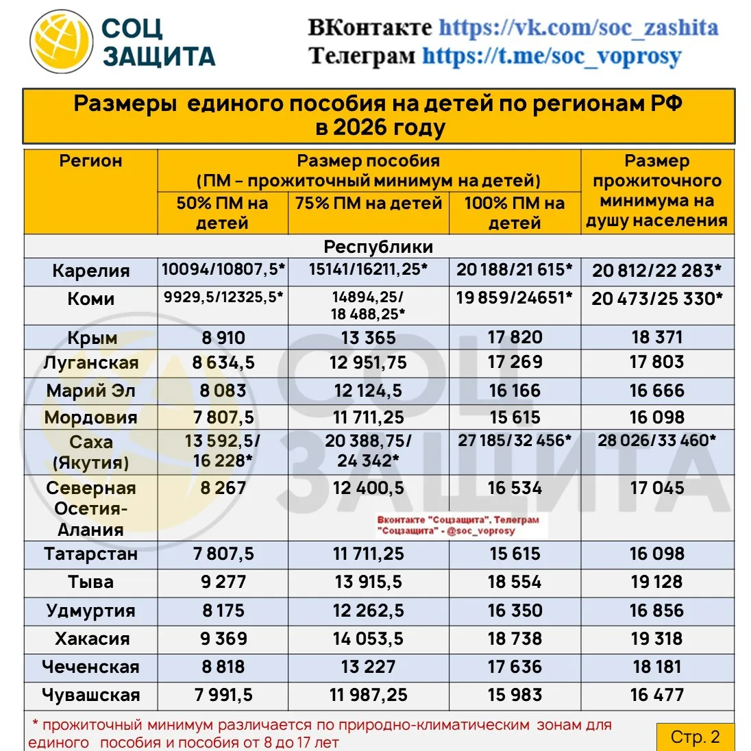 Размеры единого пособия на детей (50,75 и 100%) и прожиточный минимум на душу населения на 2026 год по регионам РФ.