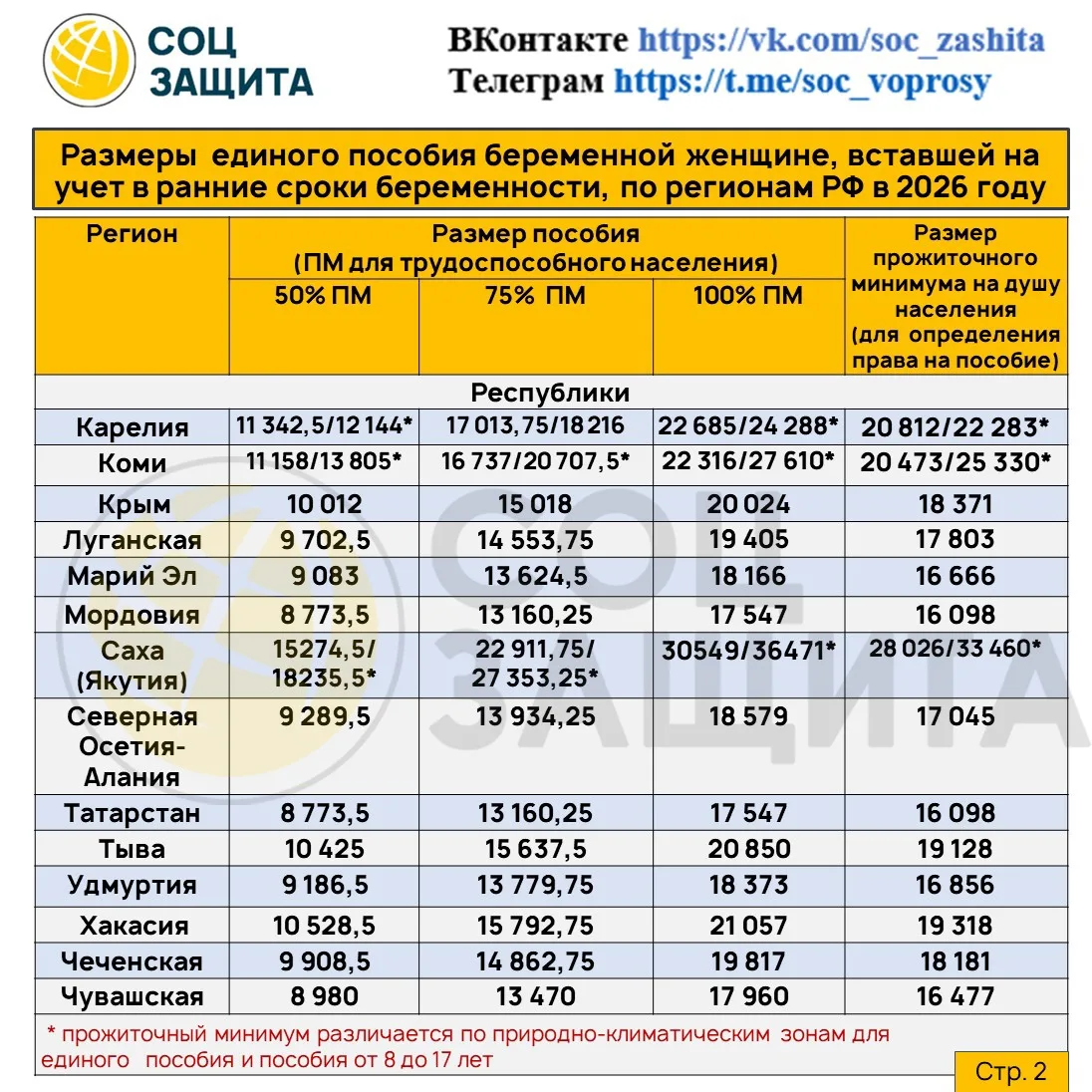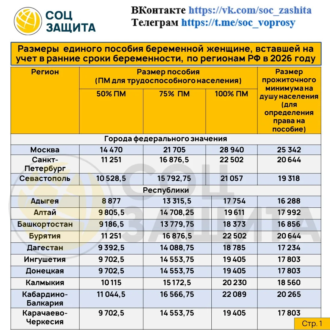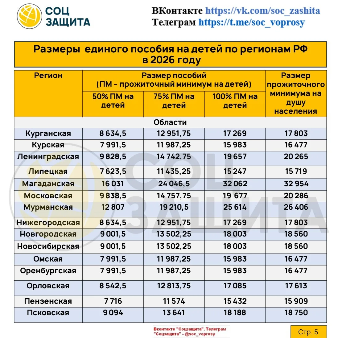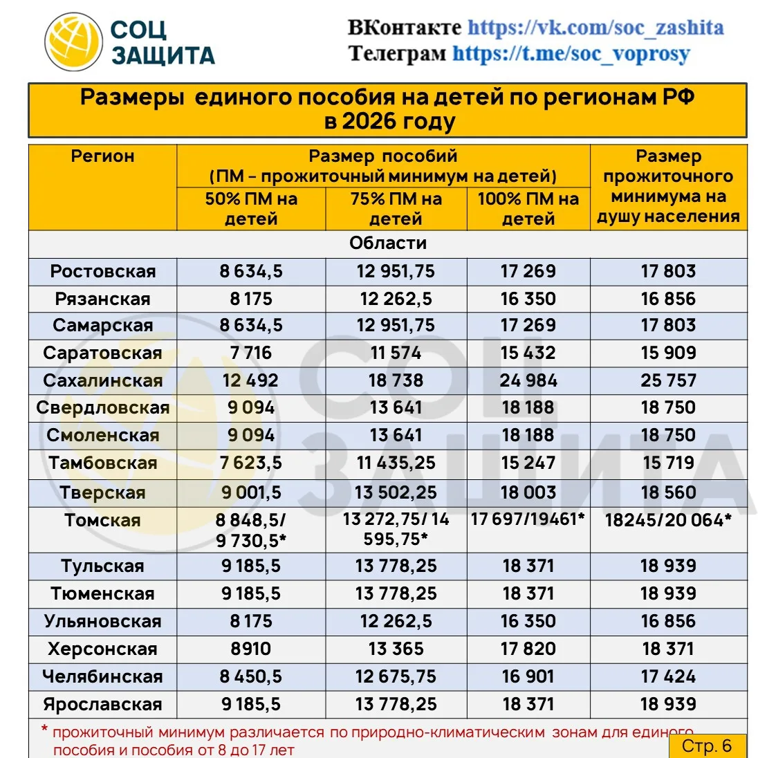 Размеры единого пособия на детей (50,75 и 100%) и прожиточный минимум на душу населения на 2026 год по регионам РФ.