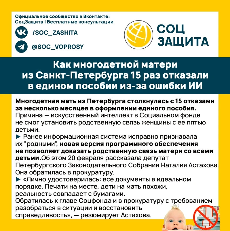 Как многодетной матери из Санкт-Петербурга 15 раз отказали в едином пособии из-за ошибки ИИ.