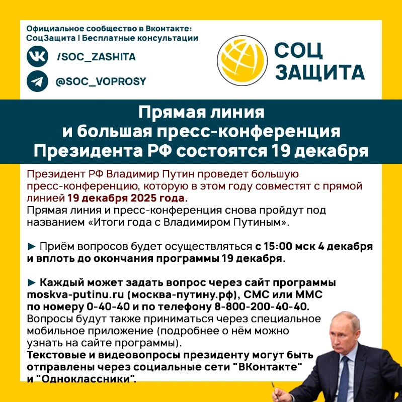 📹 Прямая линия и большая пресс-конференция Президента РФ состоятся 19 декабря. Прием вопросов начинается сегодня 4 декабря с 15.00.