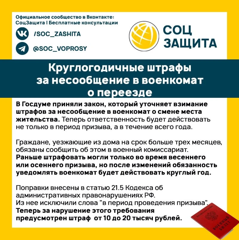 Круглогодичные штрафы за несообщение в военкомат о переезде.