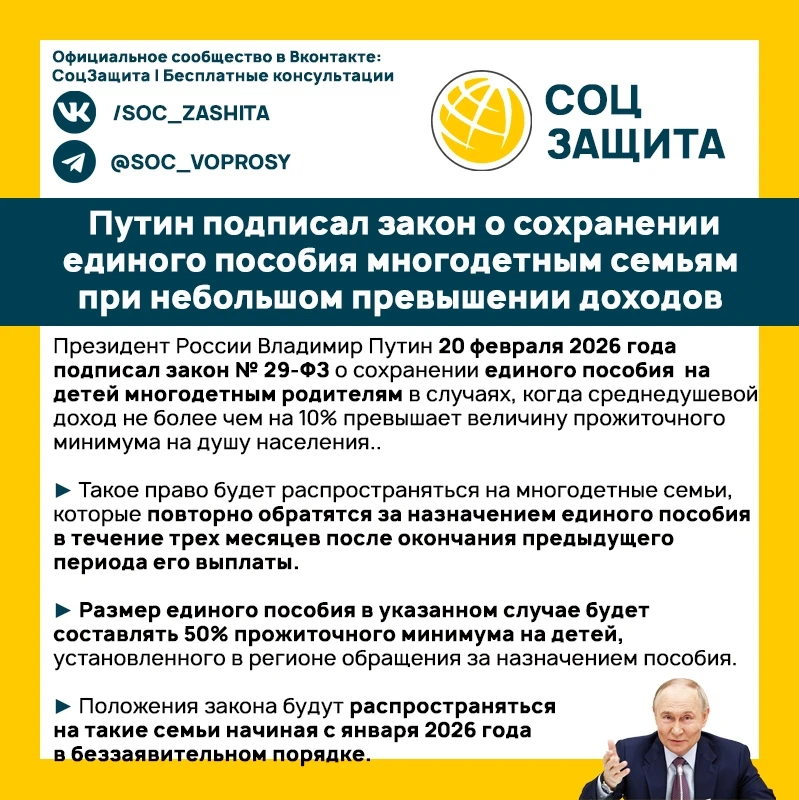 Путин подписал закон о сохранении единого пособия многодетным семьям при небольшом превышении доходов.