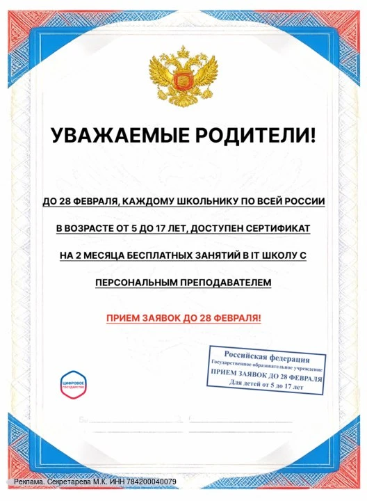 ❗️ Уважаемые родители, внимание! До 28 февраля каждый ребенок по всей России в возрасте от 5 до 17 лет может получить сертификат на 2 месяца бесплатных занятий в школе программирования с персональным преподавателем.